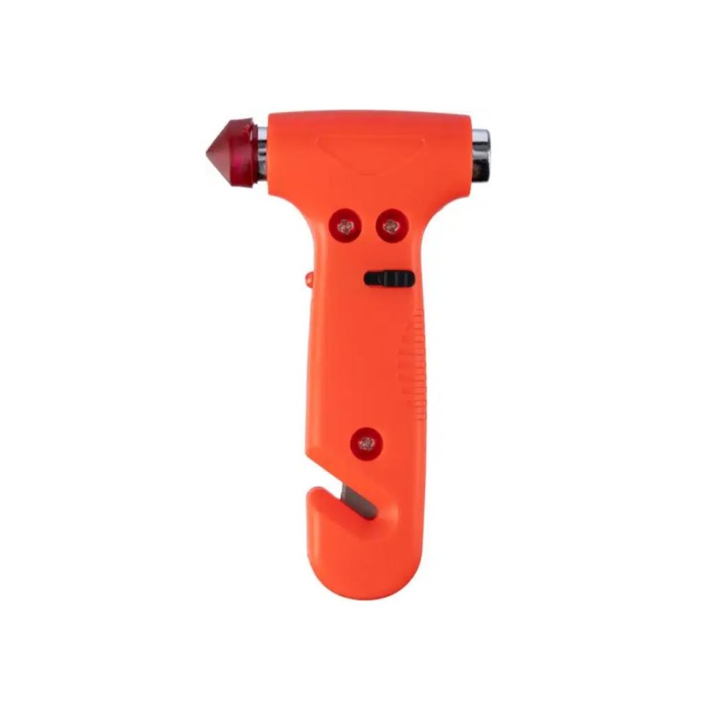 ABS vészkalapács, fehér LED lámpával (be/ki), integrált biztonságiöv-vágóval és ablakkalapáccsal. A kalapács gumiheggyel védett. Barna kartondobozba egyedileg csomagolva érkezik. Emblémázás: Tamponnyomás