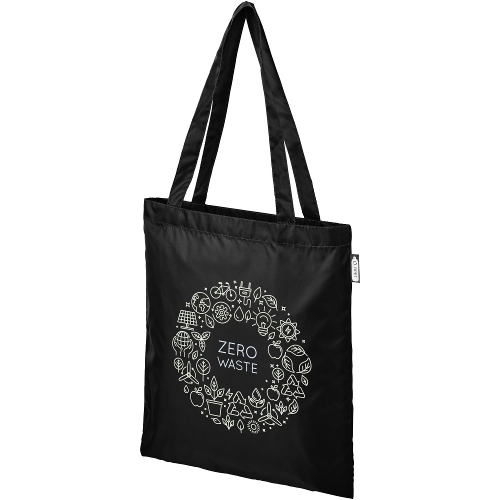 Erős táska anyaga 100% -ban újrahasznosított műanyagból készült, amely hozzájárul a műanyaghulladék csökkentéséhez. Fülmagassága 27 cm. Teherbírás: 10 kg. 190T of újrahasznosított PET műanyag. Emblémázás: Szitanyomás