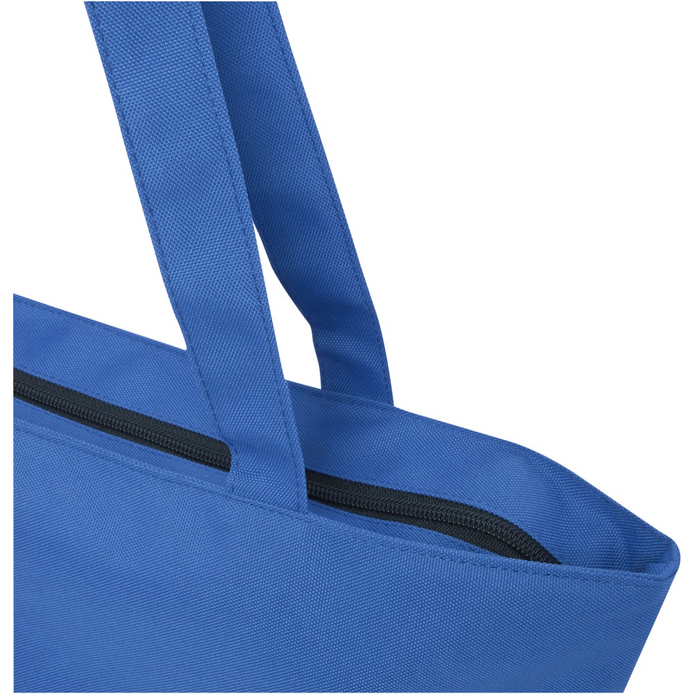 A vízlepergető 600D rPET anyagból készült Panama GRS újrahasznosított cipzáras táska tökéletes és fenntartható választás, ha rendezvényre, strandra vagy bevásárlásra készülsz. Egy cipzáras főrekesszel és egy cipzáras belső zsebbel rendelkezik, amely elég nagy a telefonod vagy más értékes holmi tárolására. Fülei 34 cm hosszúak, ezért a táska könnyen hordozható vállon. Teherbírás: 10 kg. PVC-mentes. Emblémázás: Szitanyomás