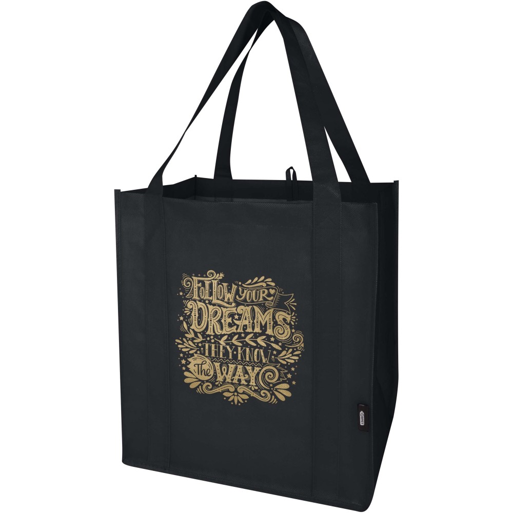 A Liberty GRS tanúsítvánnyal rendelkező újrahasznosított bevásárlótáska tartós és szakadásálló nem szőtt RPET anyagból készült, megerősített aljrésszel, amely extra stabilitást és sokoldalú felhasználást biztosít. A táska nagy méretű főrekesszel és 25 cm hosszú fülekkel rendelkezik, így kényelmesen hordozható. Űrtartalma: 29 liter. Teherbírás: akár 12 kg. Emblémázás: Szitanyomás