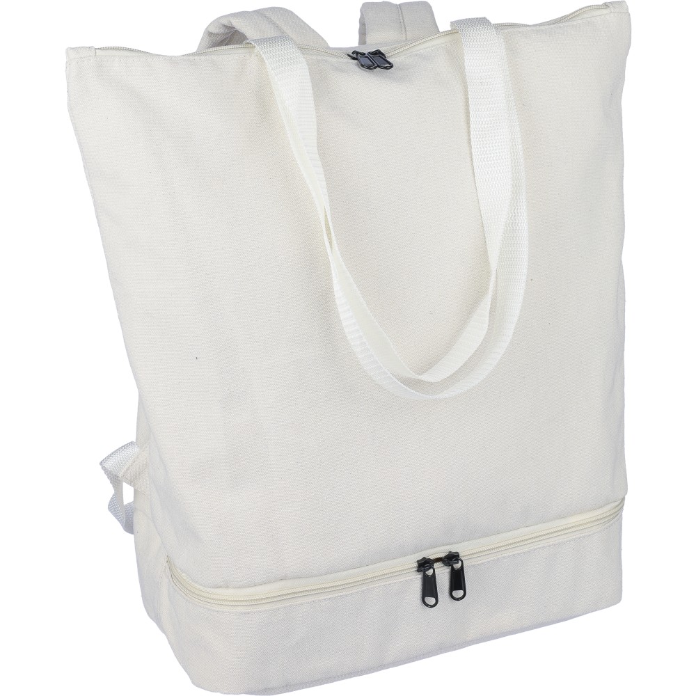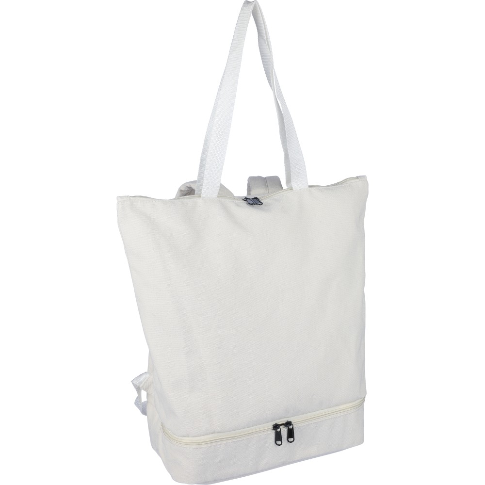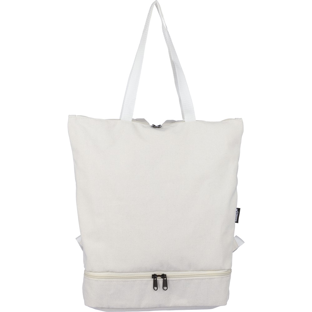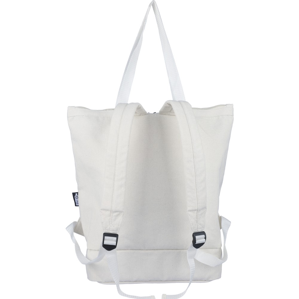Bevásárlótáska és hátizsák 330 g/m2 újahasznosított policotton anyagból, 210D poliészter béléssel. Egy nagy cipzáras rekesszel a tetején, cipzáras rekesszel az alján, 15"-es laptoptartó résszel, két belső rekesszel és egy külső cipzáras résszel. Hordozófüllel és párnázott, állítható vállpánttal. Űrtartalom: 30 liter, teherbíró képesség: 15 kg. Címkét tartalmaz. Emblémázás: Szitanyomás