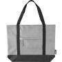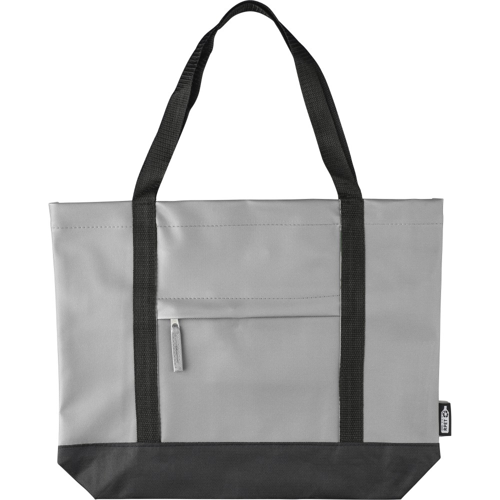 600D rPET poliészter bevásárlótáska. Mindkét oldalon PU bevonat teszi vízlepergetővé. Első cipzáras zsebbel, kicsi, belső cipzáras zsebbel és hosszú hordozófüllel. Kapacitása 10 liter. Oldalán rPET címkével. Emblémázás: Szitanyomás