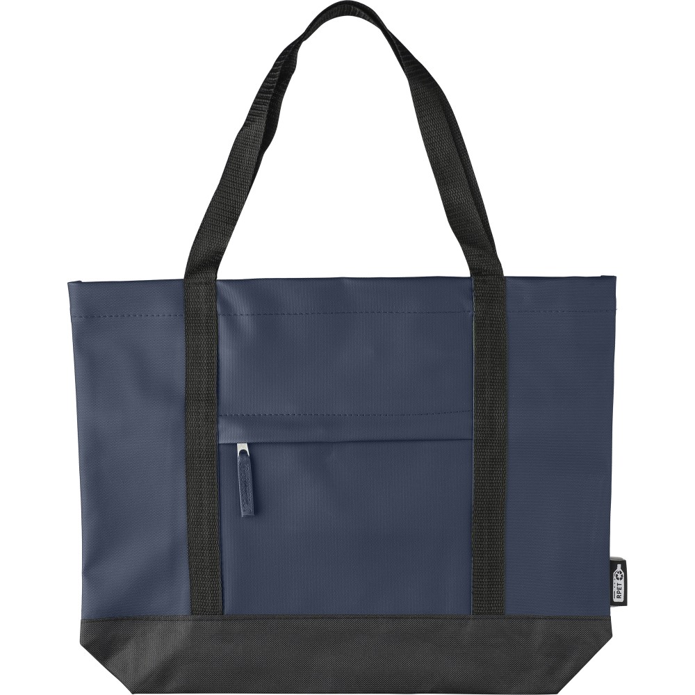 600D rPET poliészter bevásárlótáska. Mindkét oldalon PU bevonat teszi vízlepergetővé. Első cipzáras zsebbel, kicsi, belső cipzáras zsebbel és hosszú hordozófüllel. Kapacitása 10 liter. Oldalán rPET címkével. Emblémázás: Szitanyomás