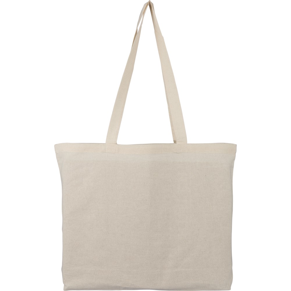Oeko-Tex minősítésű, 140 g/m2 pamutból készült natúr színű bevásárlótáska, 48 × 34 × 10 cm méretben, 70 cm hosszúságú és 2,5 cm szélességű fülekkel. Oeko-Tex címkével ellátva.