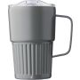 Újrahasznosított rozsdamentes acél útibögre, 450 ml. A belső 304-es, a külső 201-es rozsdamentes acélból készült, bordás markolattal és masszív fogantyúval, műanyag, csúszózáras fedéllel. Gravírozott újrahasznosított logó található a bögrén. Csomagolása barna papírdoboz. Emblémázás: Bögredekor, Gravírozás