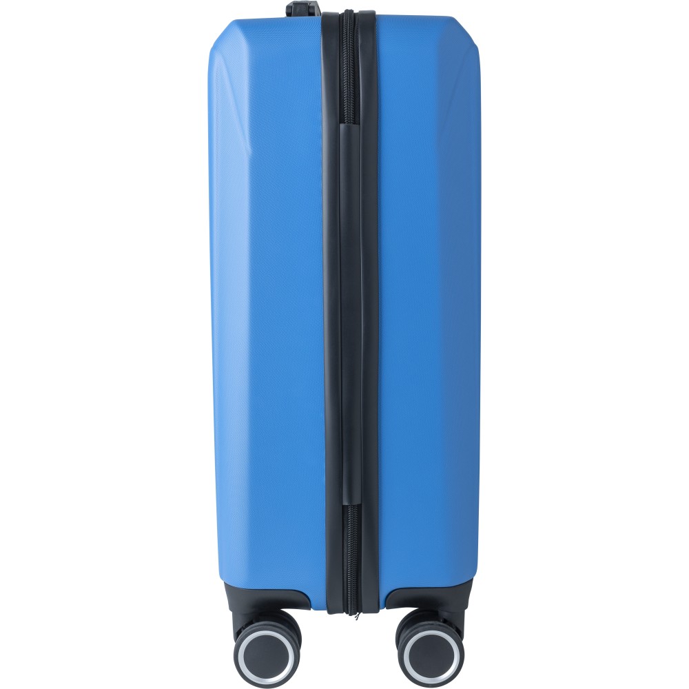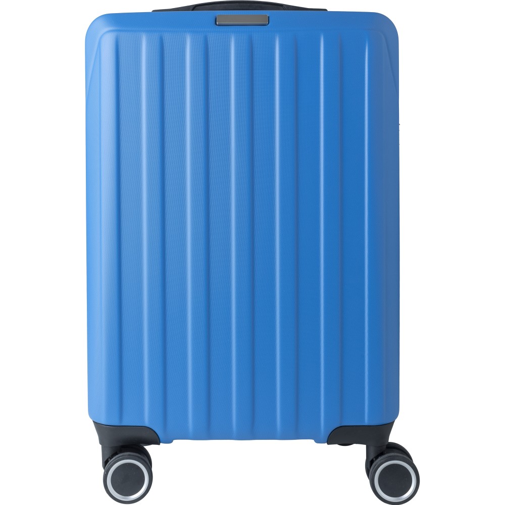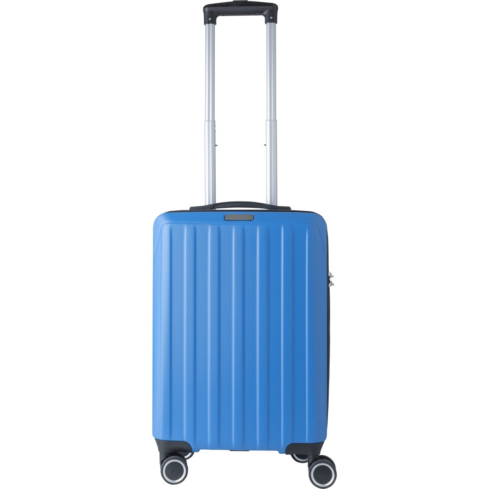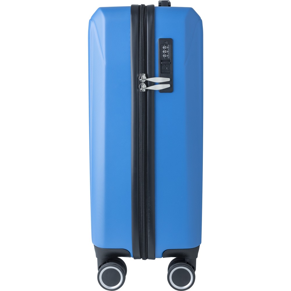 Keményfedeles ABS gurulós bőrönd 8 kerékkel (4x2), és háromszintű fém fogantyúrendszerrel. Felső műanyag fogantyút, számkombinációs zárat és 3M ragasztócsíkkal rögzíthető gravírozható táblát tartalmaz. A belső bélés anyaga 210D, a táskán belül 3 rekesz áll rendelkezésre: U-cipzáras zseb, hálós zseb és X-alakú, csattal záródó gumis heveder. Űrtartalom: 30 liter. Csomagolása barna papírdoboz. Emblémázás: Gravírozás