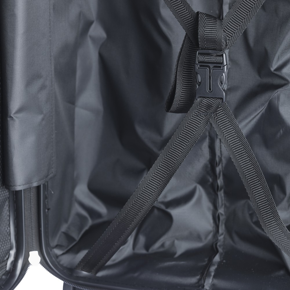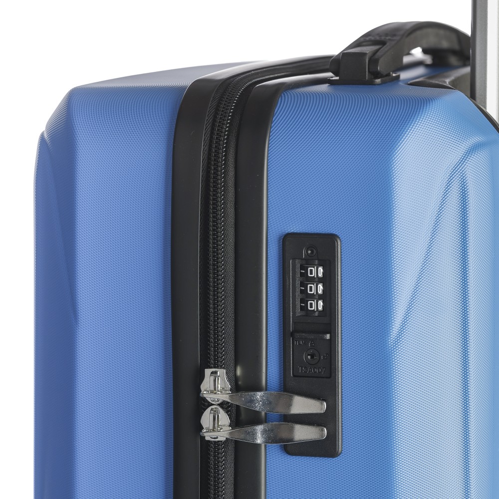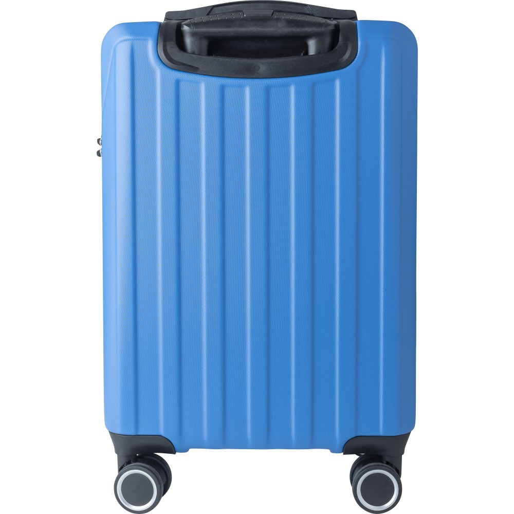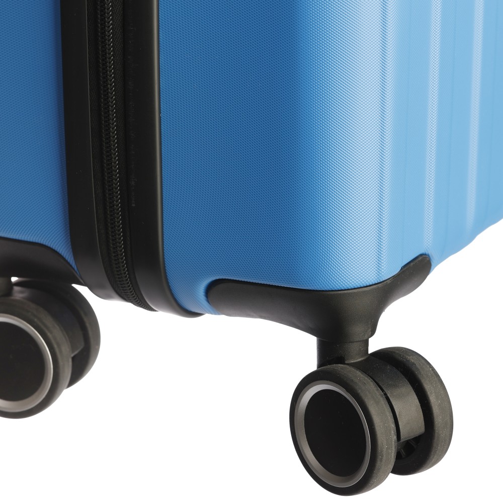 Keményfedeles ABS gurulós bőrönd 8 kerékkel (4x2), és háromszintű fém fogantyúrendszerrel. Felső műanyag fogantyút, számkombinációs zárat és 3M ragasztócsíkkal rögzíthető gravírozható táblát tartalmaz. A belső bélés anyaga 210D, a táskán belül 3 rekesz áll rendelkezésre: U-cipzáras zseb, hálós zseb és X-alakú, csattal záródó gumis heveder. Űrtartalom: 30 liter. Csomagolása barna papírdoboz. Emblémázás: Gravírozás