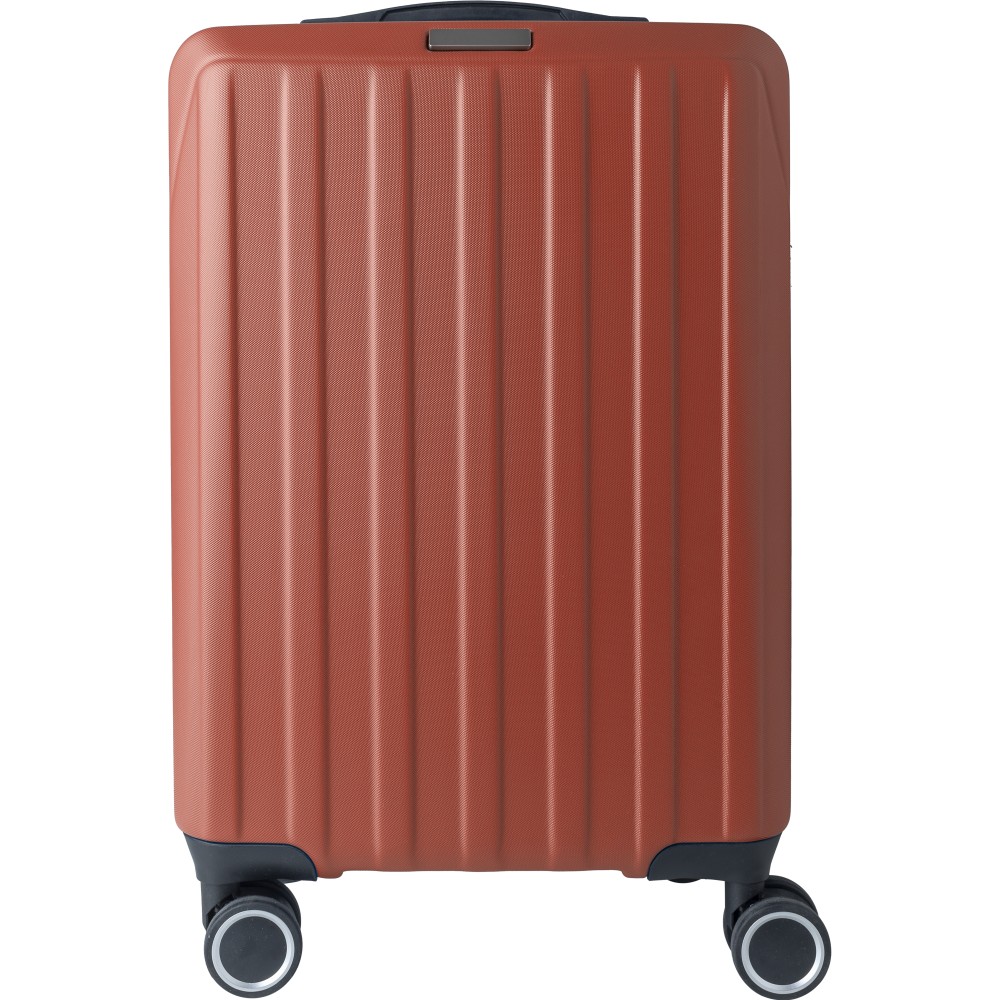 Keményfedeles ABS gurulós bőrönd 8 kerékkel (4x2), és háromszintű fém fogantyúrendszerrel. Felső műanyag fogantyút, számkombinációs zárat és 3M ragasztócsíkkal rögzíthető gravírozható táblát tartalmaz. A belső bélés anyaga 210D, a táskán belül 3 rekesz áll rendelkezésre: U-cipzáras zseb, hálós zseb és X-alakú, csattal záródó gumis heveder. Űrtartalom: 30 liter. Csomagolása barna papírdoboz. Emblémázás: Gravírozás