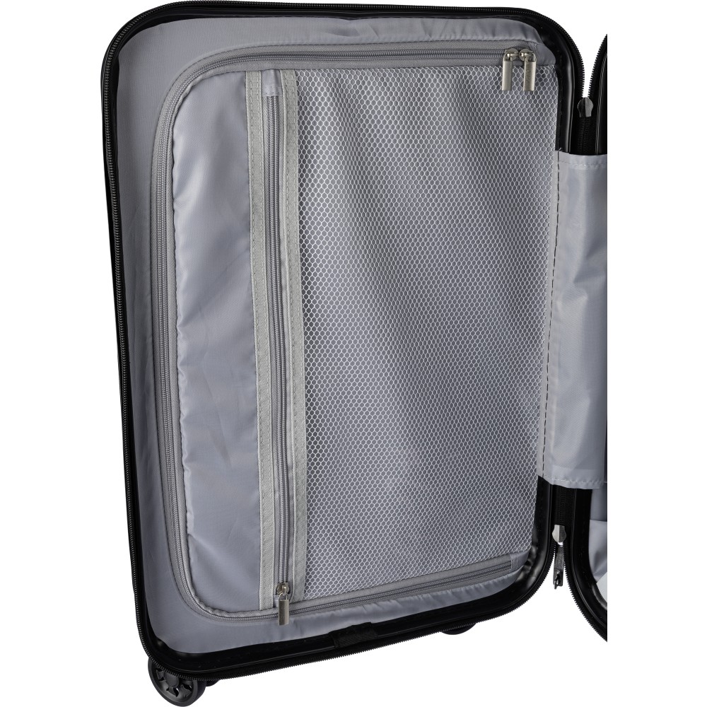 Gurulós bőrönd 8 kerékkel és háromszintű fogantyúrendszerrel. Beépített számzár és külön lapocska a lézergravírozáshoz. USB porttal. Emblémázás: Gravírozás