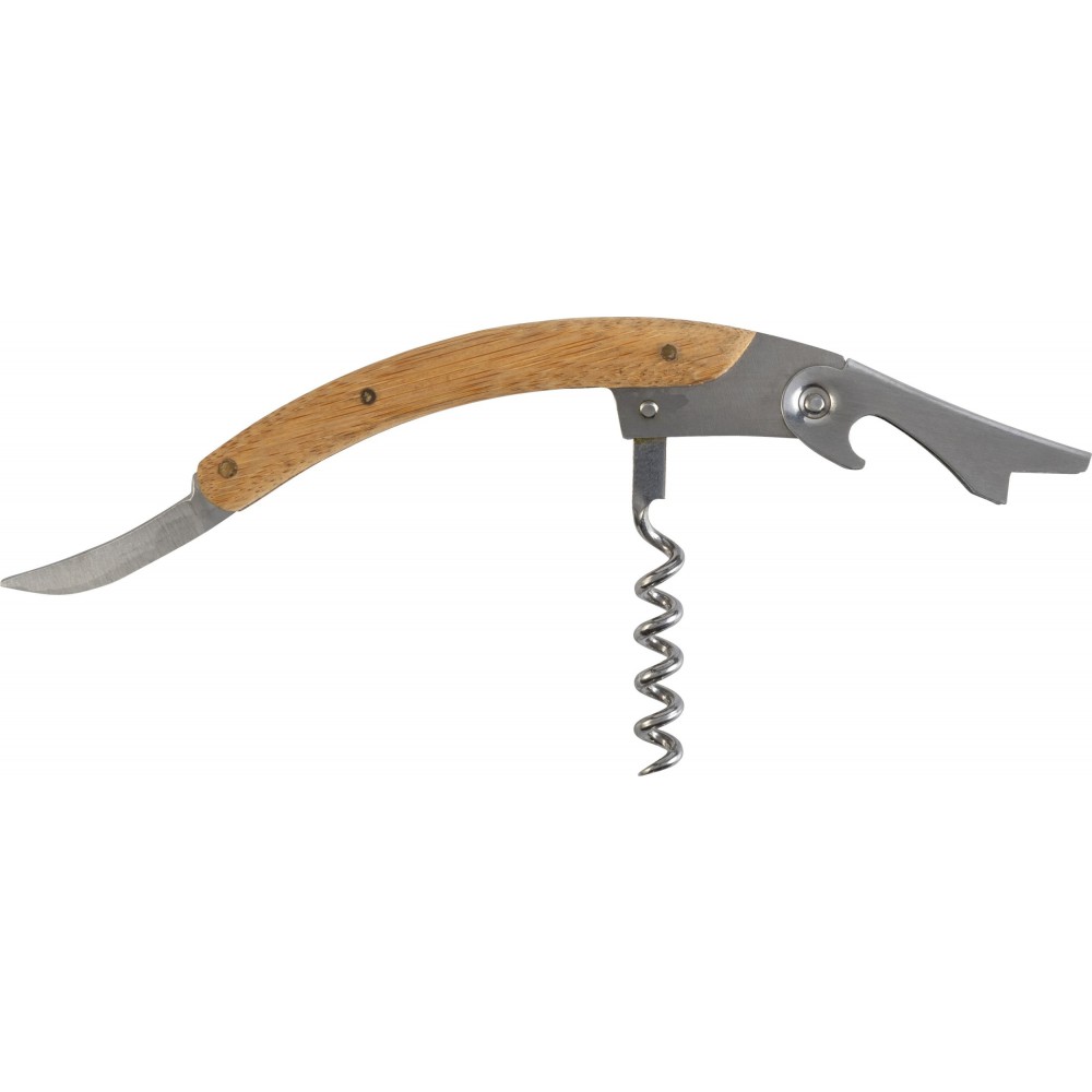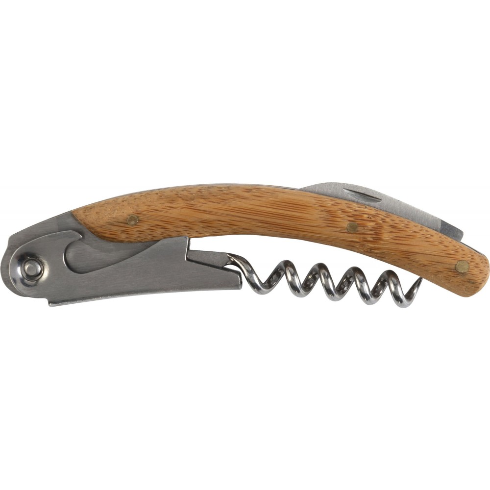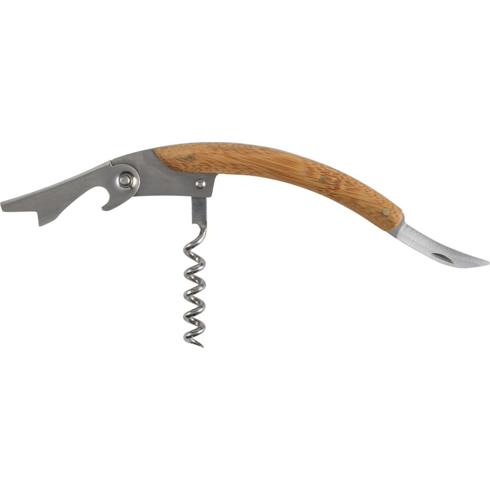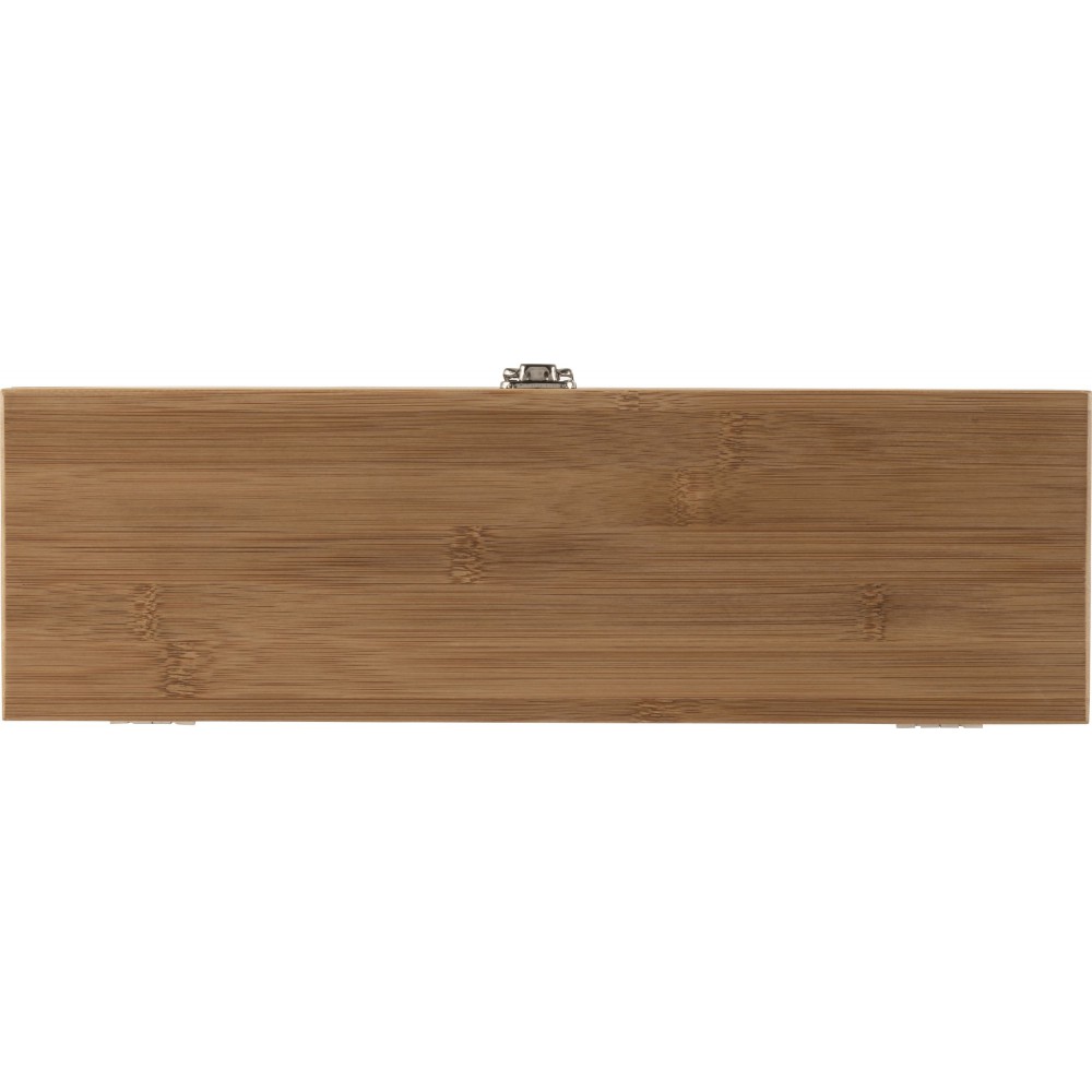 Boros ajándékkészlet bambusz dobozban. A tárgyak rozsdamentes acélból készültek bambusz részekkel. A készlet tartalma: cseppfogó, kiöntő, üvegdugó és pincérbicska. Bambusz és BPA-mentes műanyag. Emblémázás: Gravírozás, Tamponnyomás