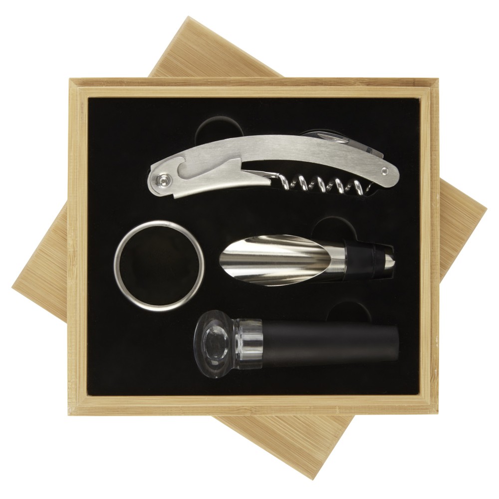 4 darabos boroskészlet pincérbicskával, dugóval, kiöntővel és cseppfogóval. Csomagolása bambuszdoboz. A bambuszt a fenntarthatósági előírások alapján termesztették. Emblémázás: Gravírozás, Tamponnyomás