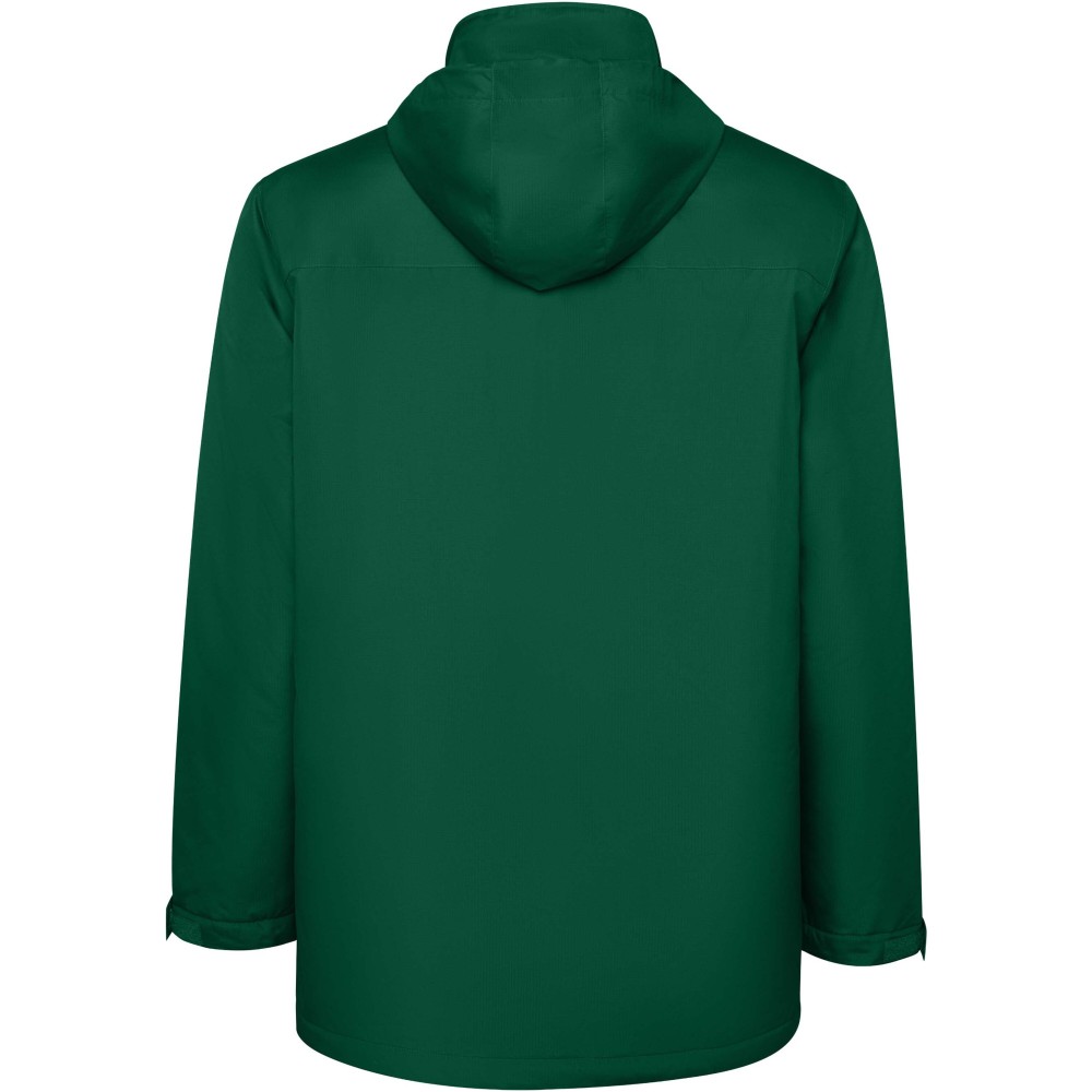 Vízálló bélelt parka férfiaknak. Magas gallérral és levehető kapucnival, tépőzáras záródással. Oldalsó zsebek cipzárral, belső zseb tépőzáras záródással. Állítható mandzsetták tépőzáras övhurkokkal. Belső hozzáférés a hátsó és a bal mellkasi megerősítésekhez. Emblémázás: Hímzés, Szitanyomás