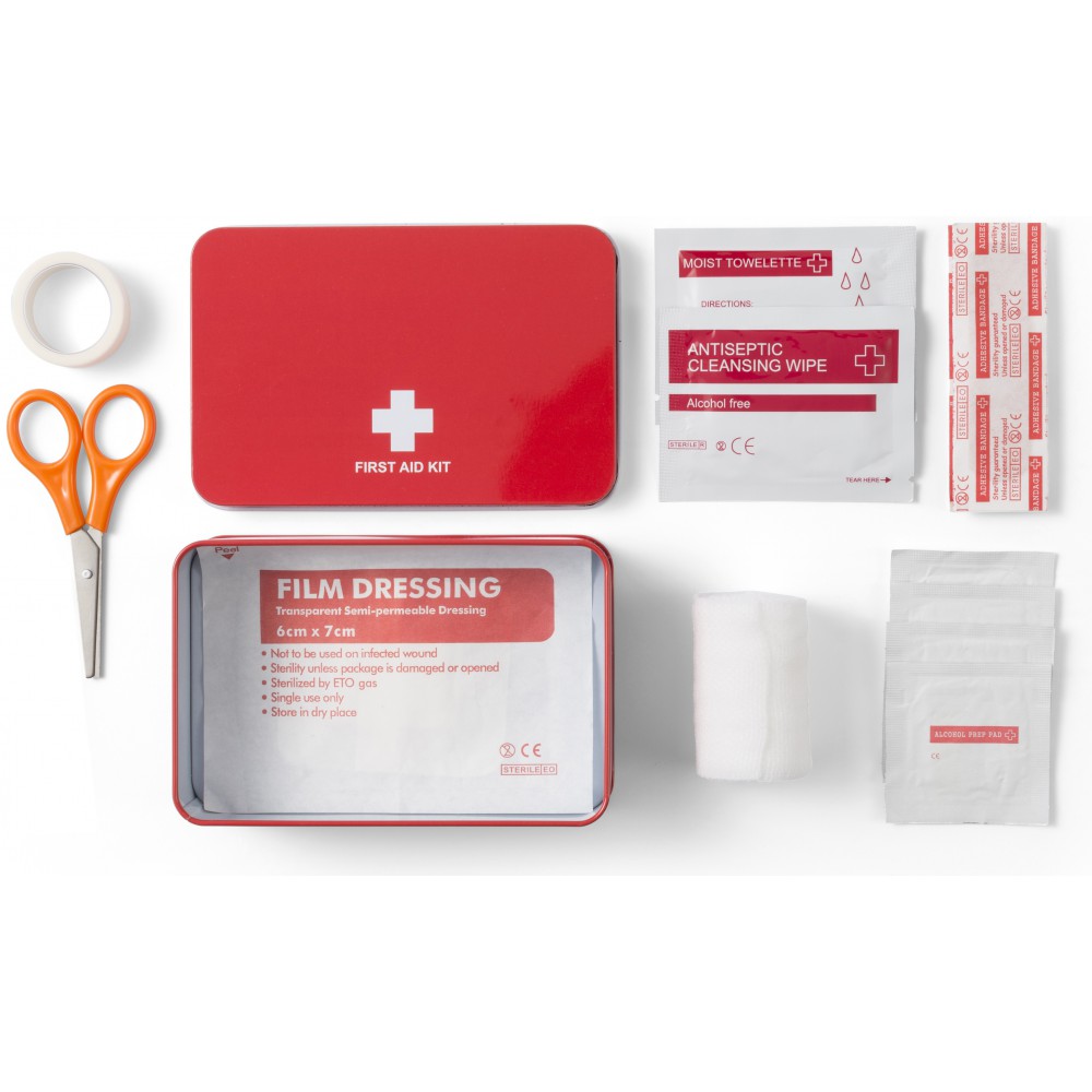 Elsősegélykészlet fém dobozban 15 kellékkel: olló, nedves törlőkendő, ragtapasz, 4 alkoholos törlőke, 5 ragtapasz, 1 gézlap, 1 fertőtlenítő törlő. Emblémázás: Tamponnyomás, UV nyomtatás