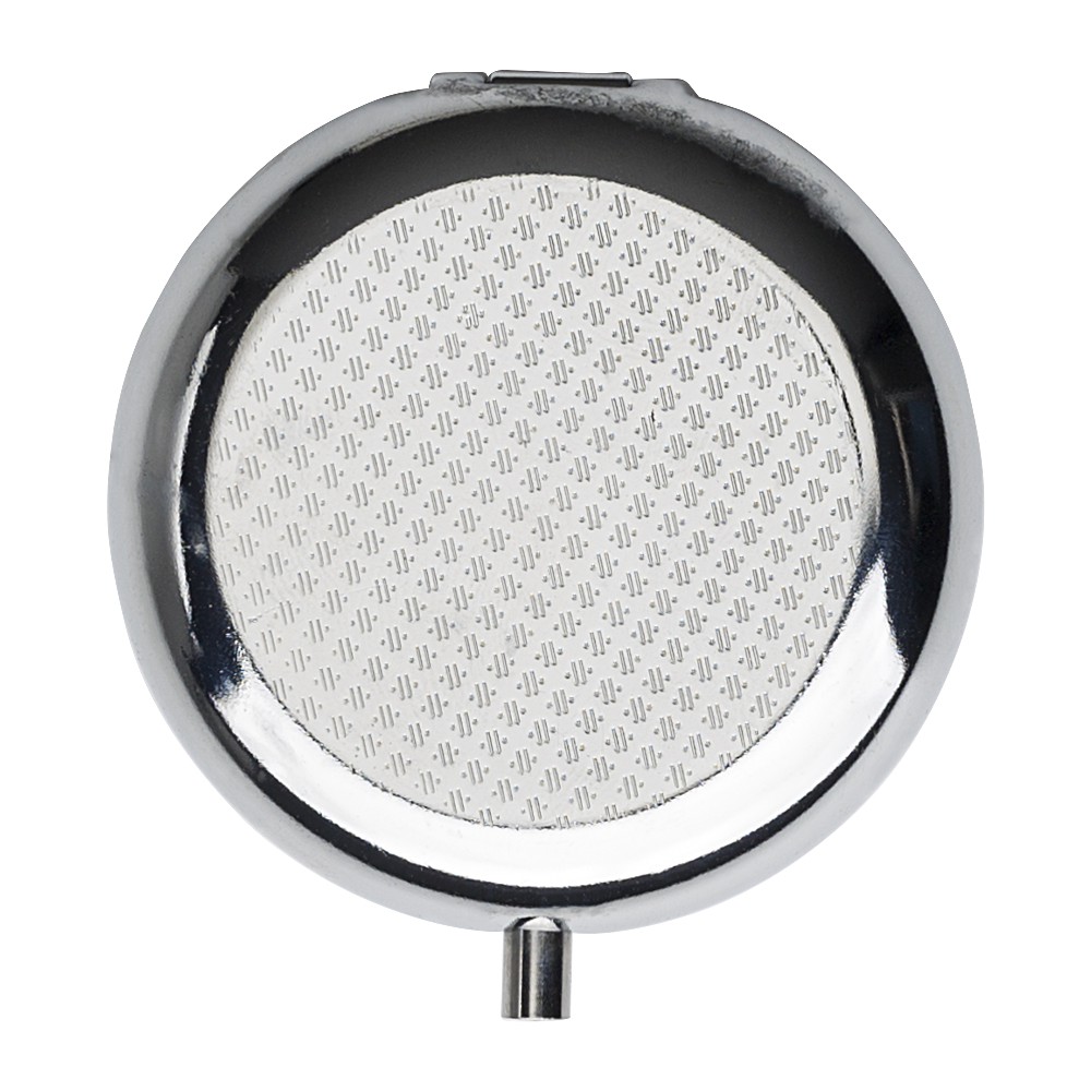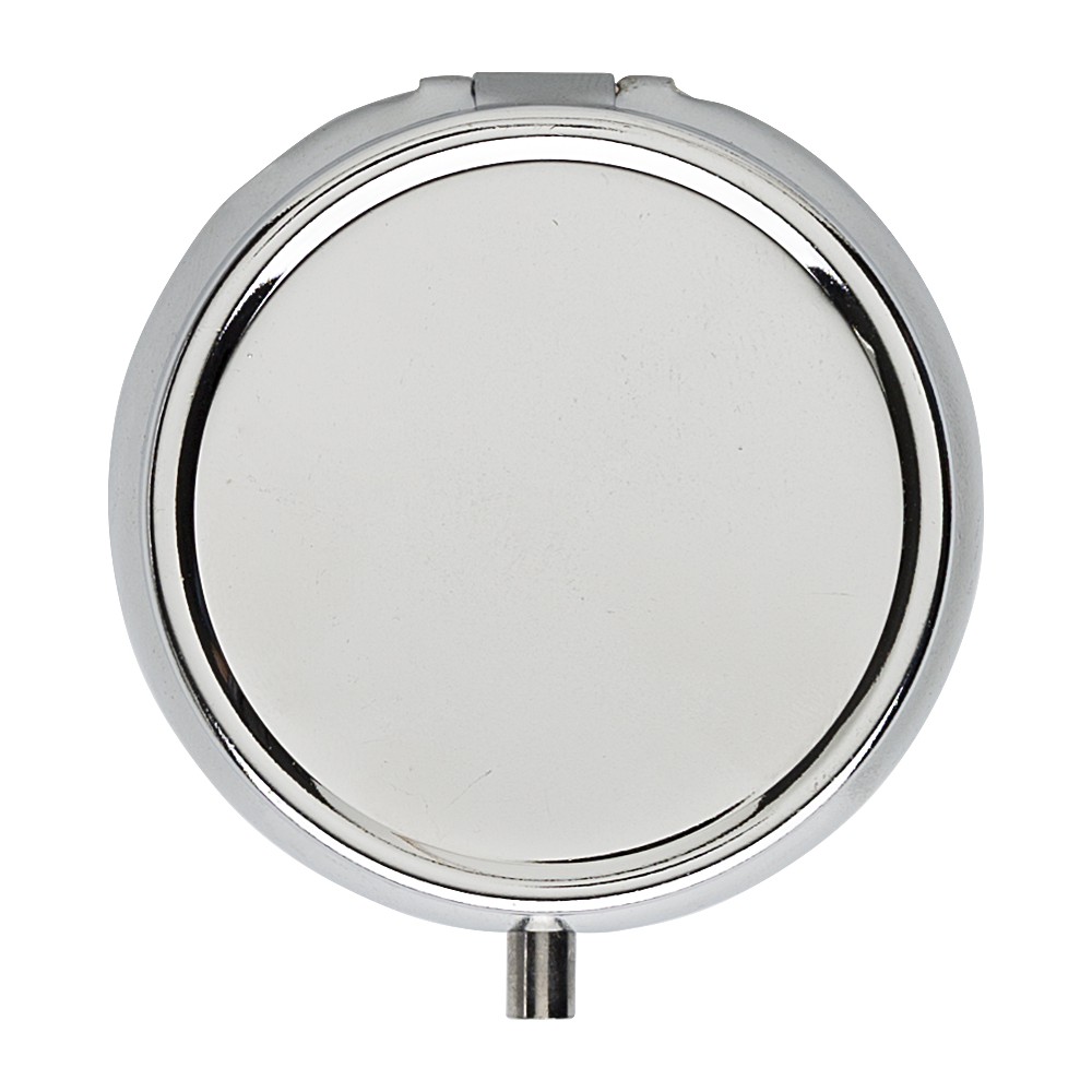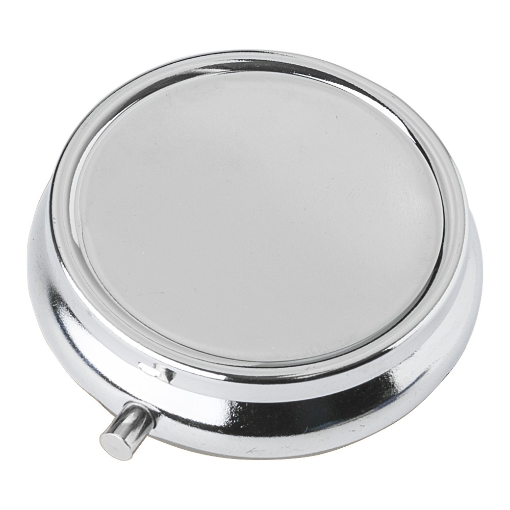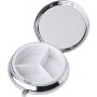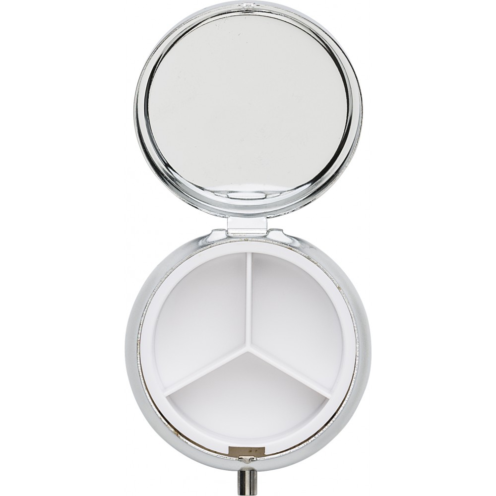 Fényes gyógyszeresdoboz 3 rekesszel. Belül PP műanyag. A fedél belsejében tükör található. Csomagolása: fehér doboz. Emblémázás: Gravírozás, Tamponnyomás