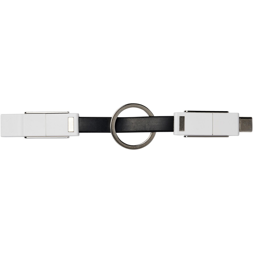 4in1 csatlakozók kulcstartóval, mágnessel. Lefed minden csatlakozási lehetőséget: USB type A, Type-C, 2-in-1 csatlakozó iOS és Android eszközökhöz. Töltésre és adatátvitelre is alkalmas. ABS műanyag. Emblémázás: Tamponnyomás