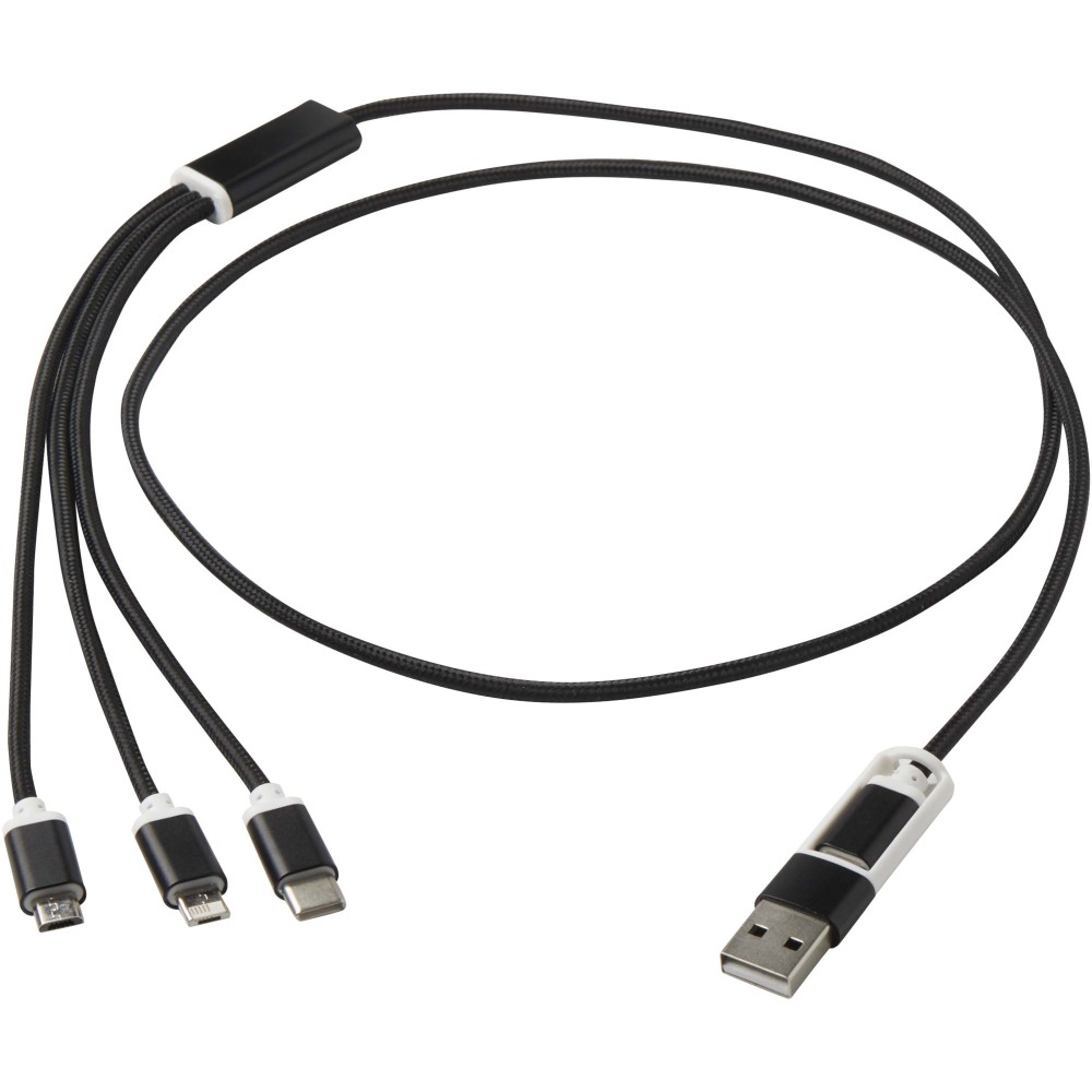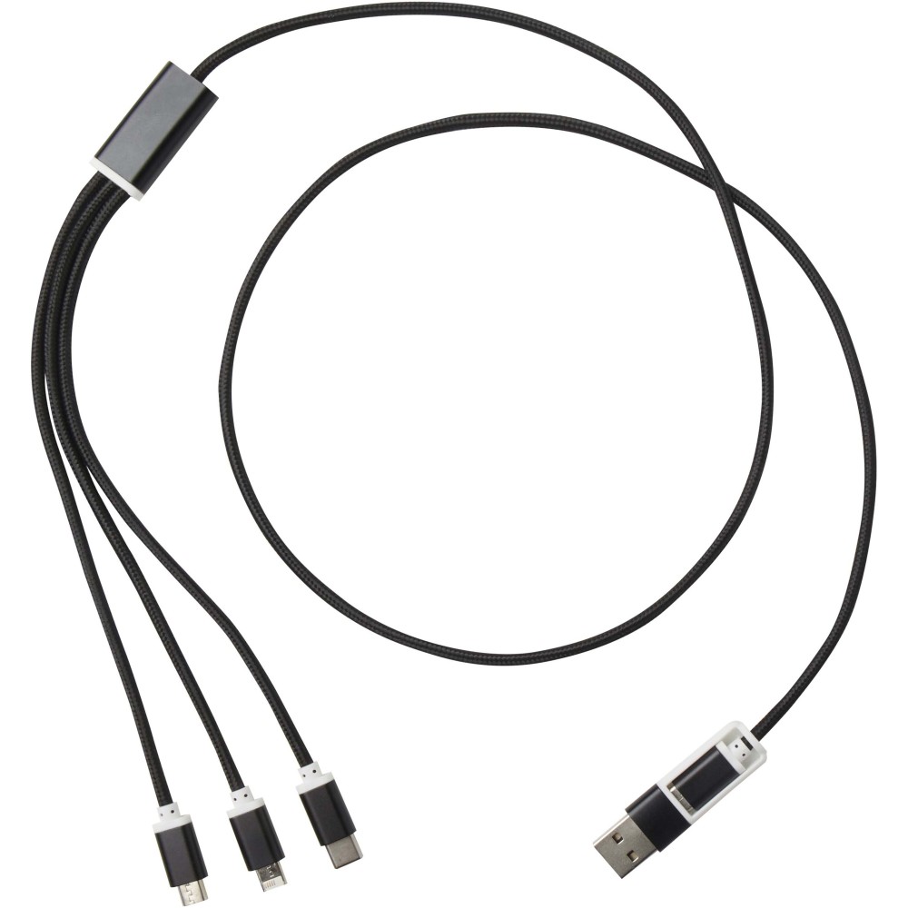 Ez a kábel USB-A és Type-C bemeneti csatlakozóval, valamint Type-C, Micro USB és Lightning/Micro USB kombinált kimeneti csatlakozóval rendelkezik. A csatlakozóknak köszönhetően a legtöbb iOS/Android okostelefont, fényképezőgépet, powerbankot és fülhallgatót töltheted. A kábel hossza 100 cm, újrahasznosított alumíniumból és RPET-ből készült. Emblémázás: Gravírozás, Tamponnyomás