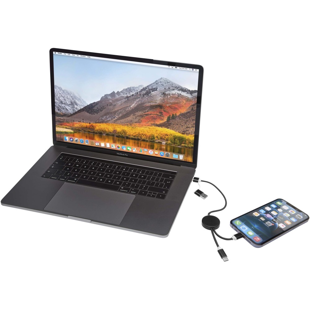 Az Alasia 5 az 1-ben adat- és 27W-os gyorstöltő kábel tartós és elegáns újrahasznosított alumíniumból és műanyagból készült. A kábel USB-A és Type-C bemeneti csatlakozókkal, valamint Type-C és Lightning/Micro USB kombinált kimeneti csatlakozóval rendelkezik. Az USB-A?USB-C kapcsolat maximális teljesítménye 27W, míg az összes többi kapcsolat maximális teljesítménye 15W. Kompatibilis a CarPlay és az Android Auto rendszerekkel. Akár otthon, az irodában vagy útközben használod, az Alasia kábel teljesítményt és stílust garantál. Kábel hossza: 30 cm. Emblémázás: Gravírozás