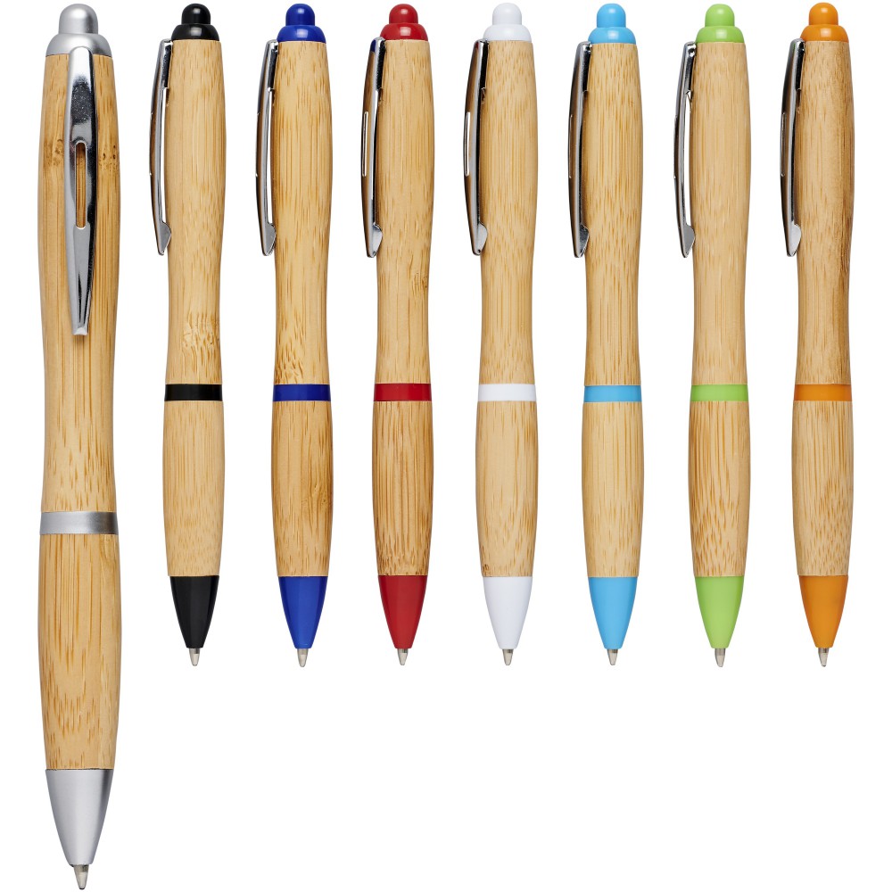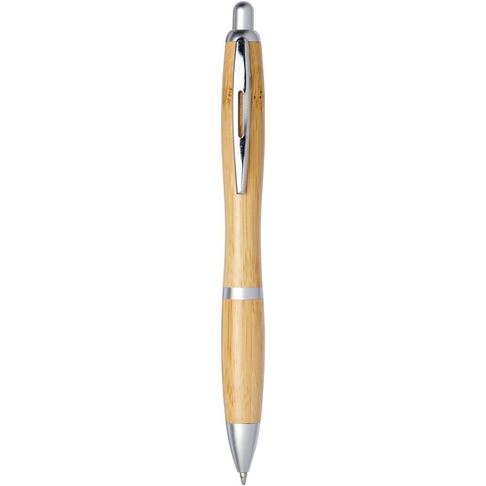 Golyóstoll nyomógombos mechanikával. Bambusz tolltest, króm klipsz, ABS műanyag. A bambusz természetes alapanyag, árnyalata darabonként változó lehet. Emblémázás: Tamponnyomás