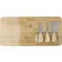 Bambusz vágódeszka három sajtvágó eszközzel, amelyek a deszkán lévő kivágások belsejébe illeszkednek. Csomagolása barna kartondoboz. Emblémázás: Gravírozás