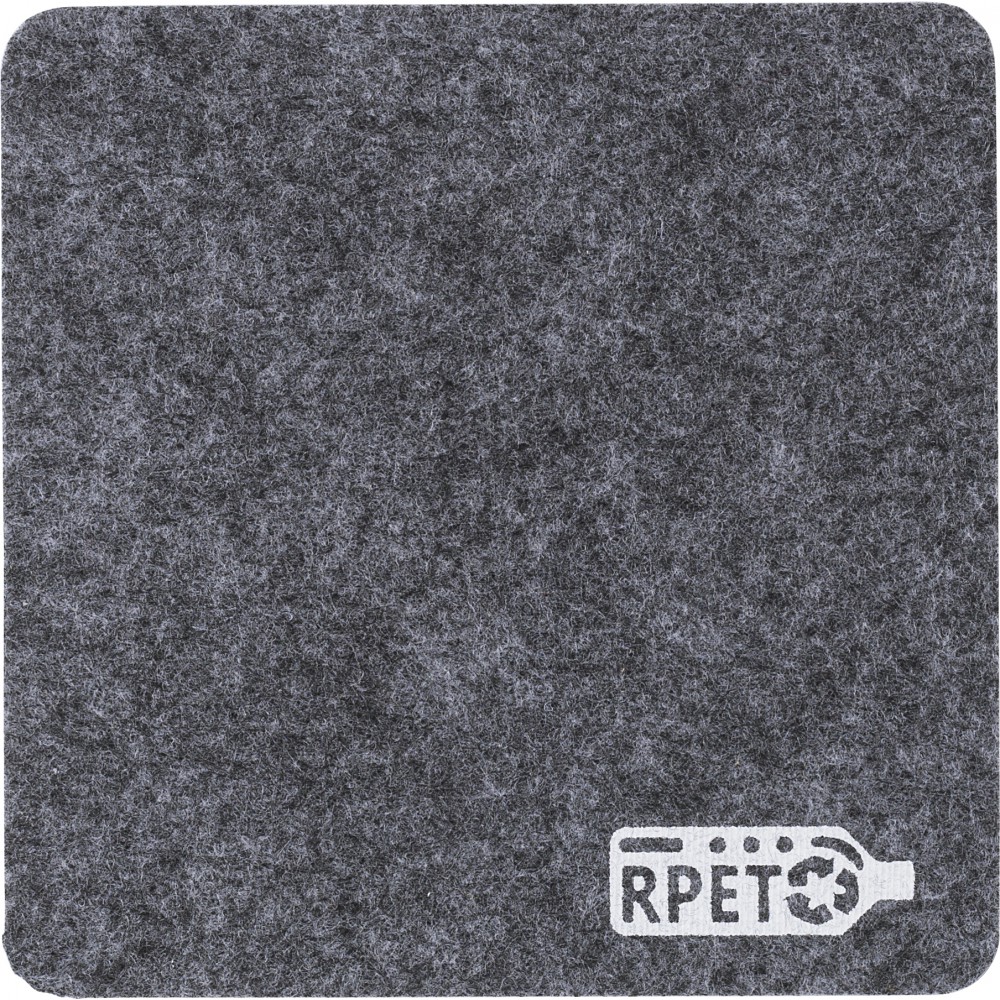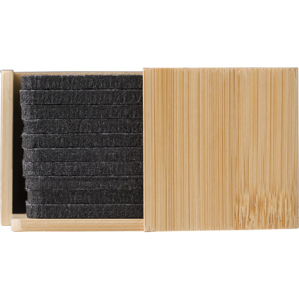 RPET filc poháralátét szett bambusz tokban. 10 darab alátétet tartalmaz. Barna kartondobozba csomagolva. Minden alátéten szerepel az újrahasznosított jel nyomata. Emblémázás: Gravírozás, Szitanyomás, Tamponnyomás