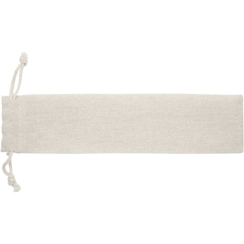 Root evőeszköz-készlet, amely egy villát, kést, kanalat, szívószálat és egy tisztítókefét tartalmaz. Az evőeszközök tartós és könnyen tisztítható rozsdamentes acélból, nyeleik pedig bükkfából készültek. Pamut tasakban szállítjuk. Emblémázás: Gravírozás, Szitanyomás, Tamponnyomás