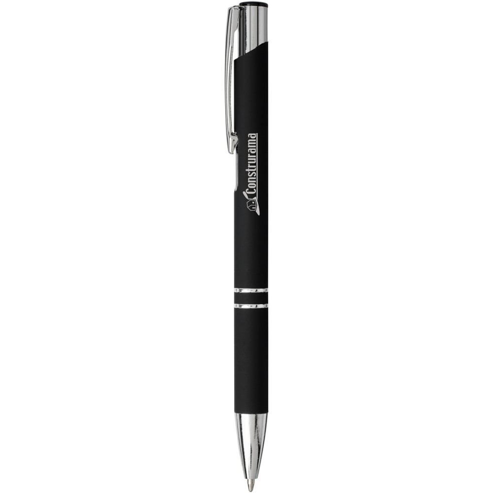 Nyomógombos golyóstoll puha tapintású bevonattal. Lézergravírozáskor megjelenik a toll fényes króm, felület alatti rétege. Fekete tollbetéttel. Emblémázás: Gravírozás