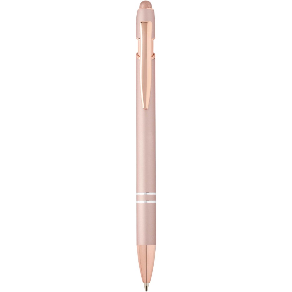 Nanna golyóstoll elegáns rózsaarany színben. A toll teste újrahasznosított alumíniumból, az érintőceruza pedig szilikonból készült, így érintőképernyős eszközökhöz is használható. Az újrahasznosított alumínium csökkenti a hulladéklerakók terhelését, segít megőrizni a természeti erőforrásokat, és célja az üvegházhatású gázok kibocsátásának mérséklése. Tinta színe: kék. Íráshossz: 800 méter. Tollhegy mérete: 1,0 mm. Emblémázás: Gravírozás, UV nyomtatás