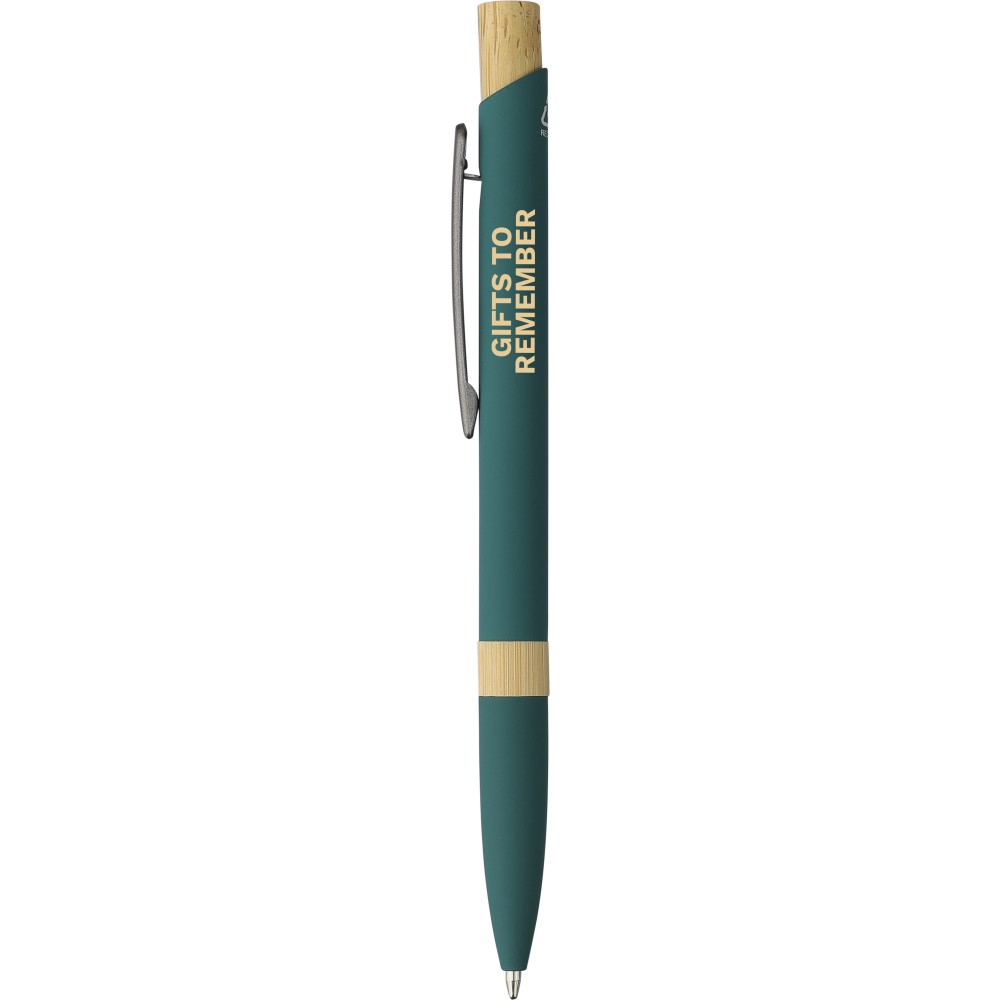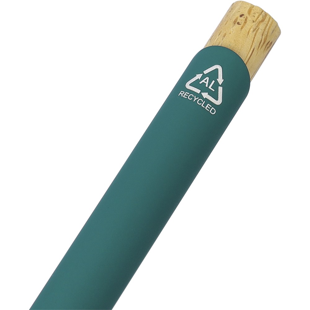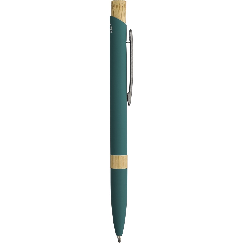 Golyóstoll újrahasznosított alumíniumból, gumírozott bevonattal, bambusz nyomógombbal és bambusz gyűrűvel a tolltesten. Kék tollbetéttel. A tollhegy vastagsága 1.0 mm, íráshossz: kb. 800 méter. Az újrahasznosított anyagra utaló logó a tollra van gravírozva. Emblémázás: Gravírozás