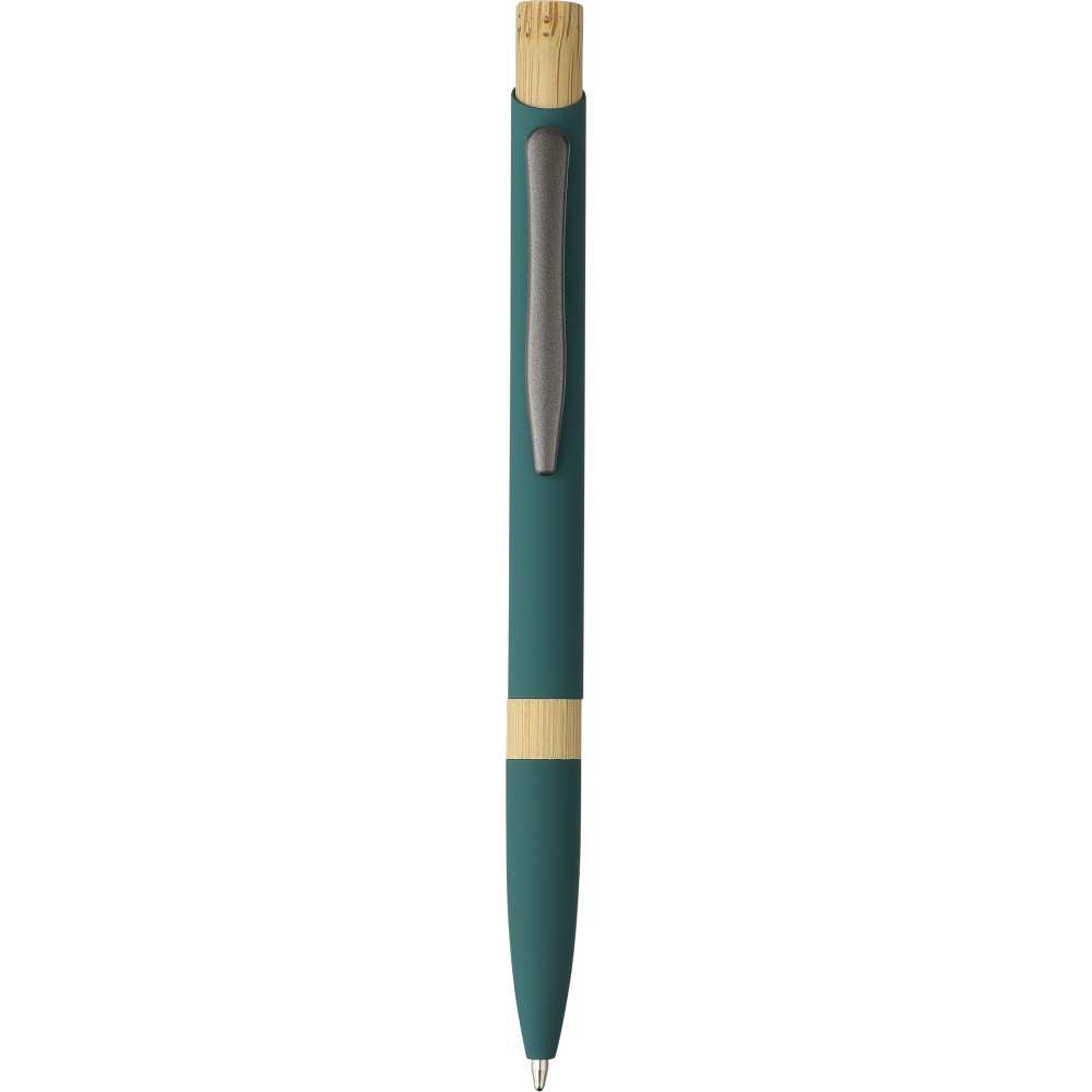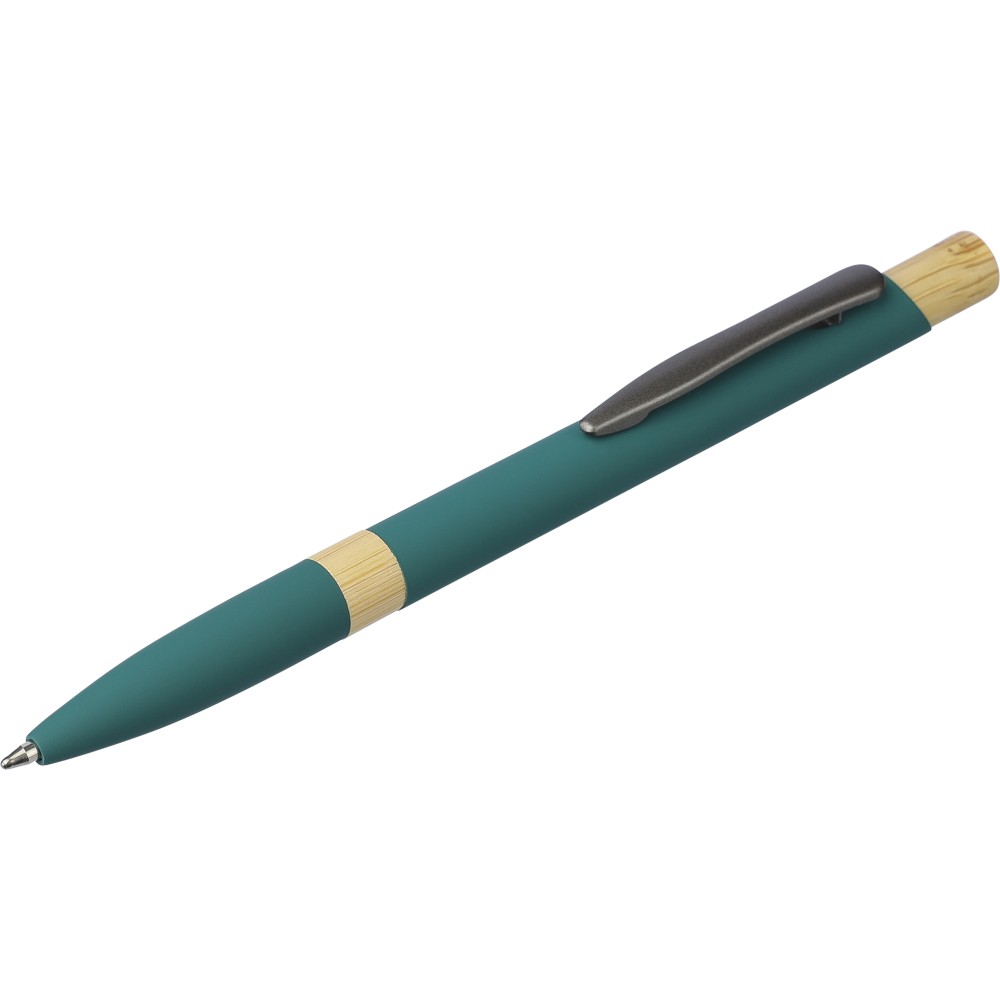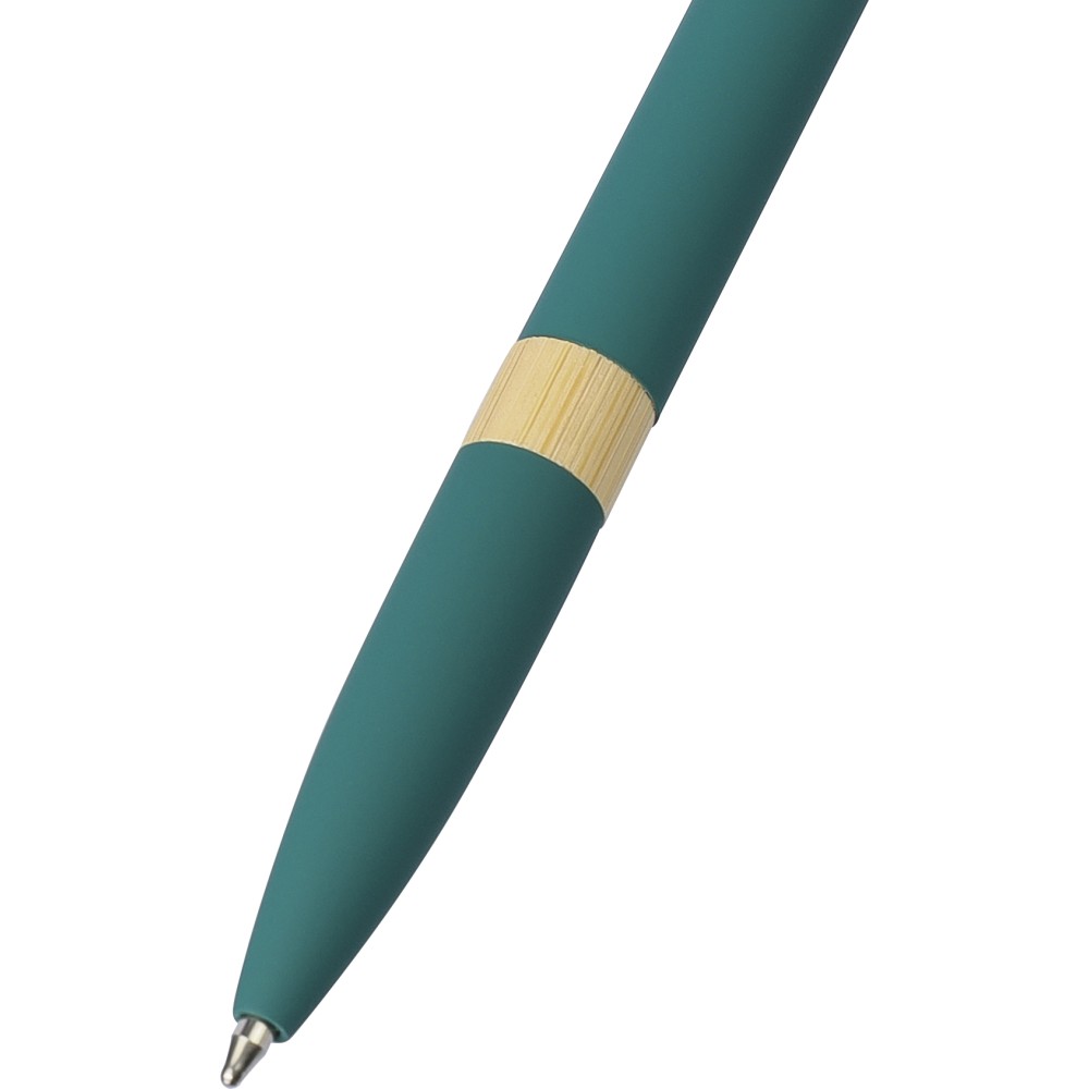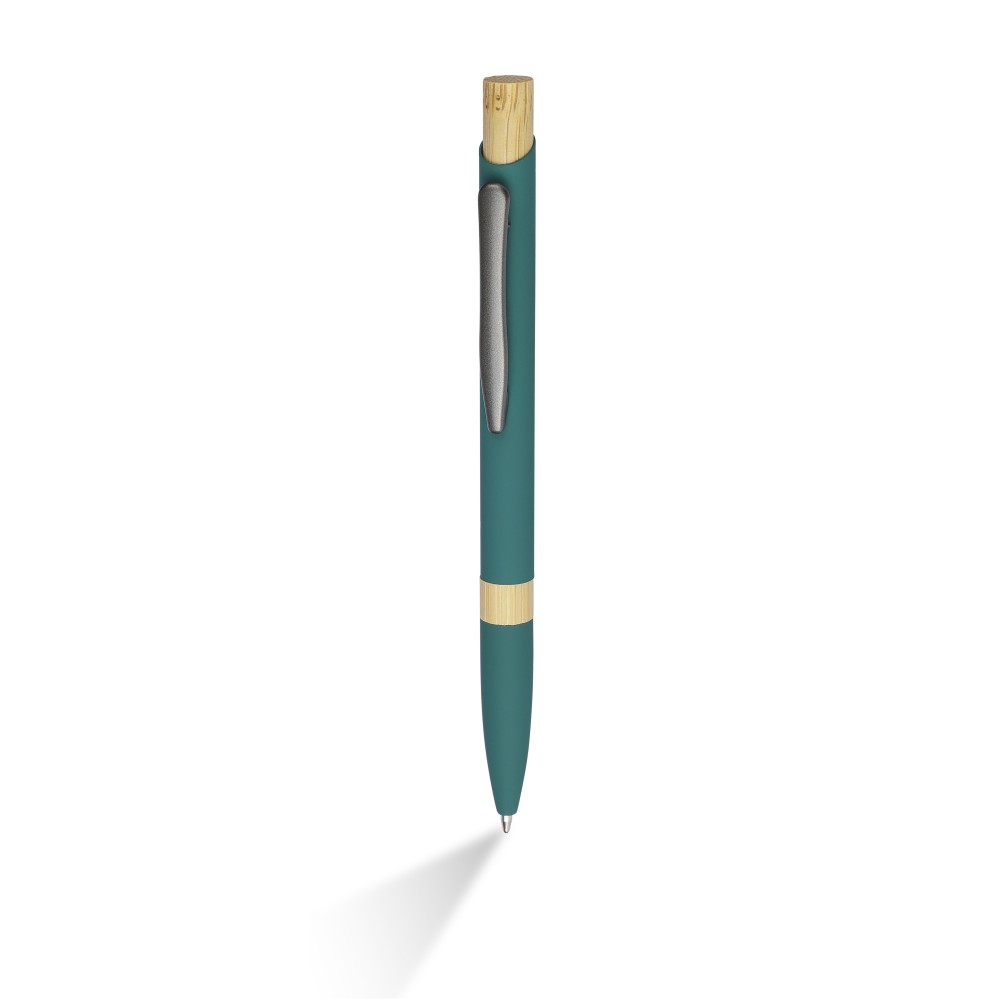 Golyóstoll újrahasznosított alumíniumból, gumírozott bevonattal, bambusz nyomógombbal és bambusz gyűrűvel a tolltesten. Kék tollbetéttel. A tollhegy vastagsága 1.0 mm, íráshossz: kb. 800 méter. Az újrahasznosított anyagra utaló logó a tollra van gravírozva. Emblémázás: Gravírozás