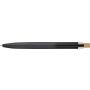 Újrahasznosított alumíniumból készült, lakkozott, nyomógombos golyóstoll bambusz nyomógombbal, rPET díszítéssel és fém klippel. A tolltesten gravírozott recycled (újrahasznosított) alapanyagra utaló logó található. Megközelítőleg 700 méter íráshossz, kék tollbetéttel.