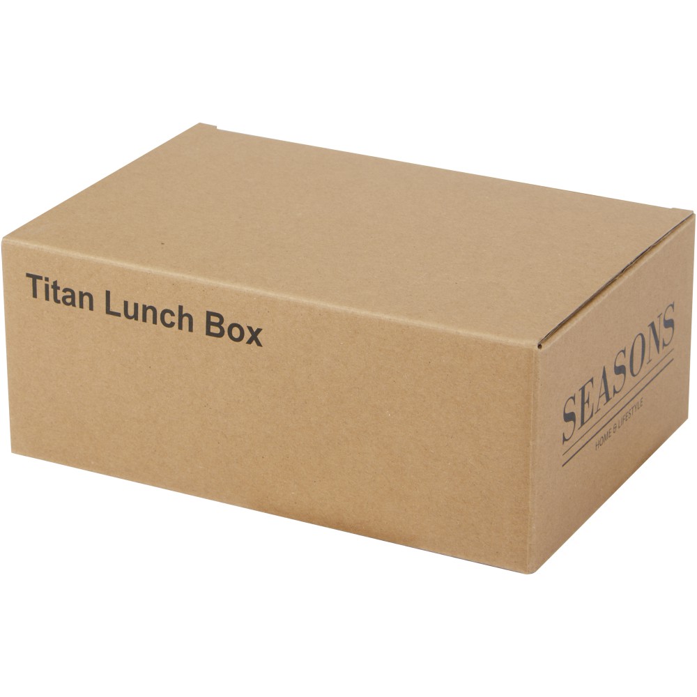 A Titan uzsonnásdoboz újrahasznosított rozsdamentes acélból készült, így a hagyományos uzsonnásdobozokhoz képest fenntarthatóbb választás. Újrahasznosított zacskóba csomagolva, majd újrahasznosított kraftpapír dobozba helyezve. Mosogatógépben mosható. Űrtartalom: 750 ml. Emblémázás: Gravírozás