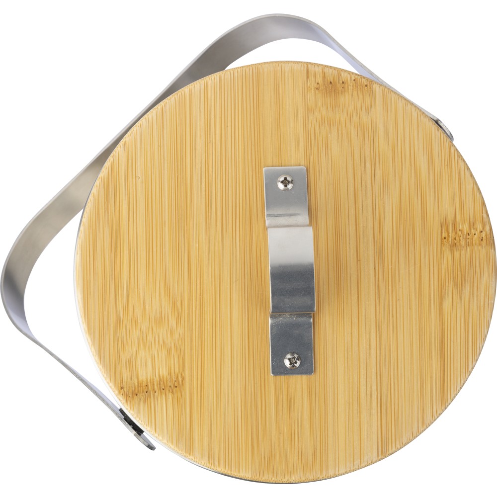 Duplafalú jegesvödör bambuszfedéllel és rozsdamentes acél fogantyúval. A belső 304-es, a külső pedig 201-es rozsdamentes acélból készült. Jégcsipesszel, 1200 ml-es űrtartalommal. Csomagolása barna papírdoboz. Emblémázás: Gravírozás