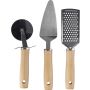 Fém és fa konyhai eszközkészlet vászontasakban. A készlet egy rozsdamentes acél reszelőt, tortalapátot és pizzavágót tartalmaz. Valamennyi eszköz fa nyéllel készült. Mosogatógépben nem tisztítható. Emblémázás: Gravírozás