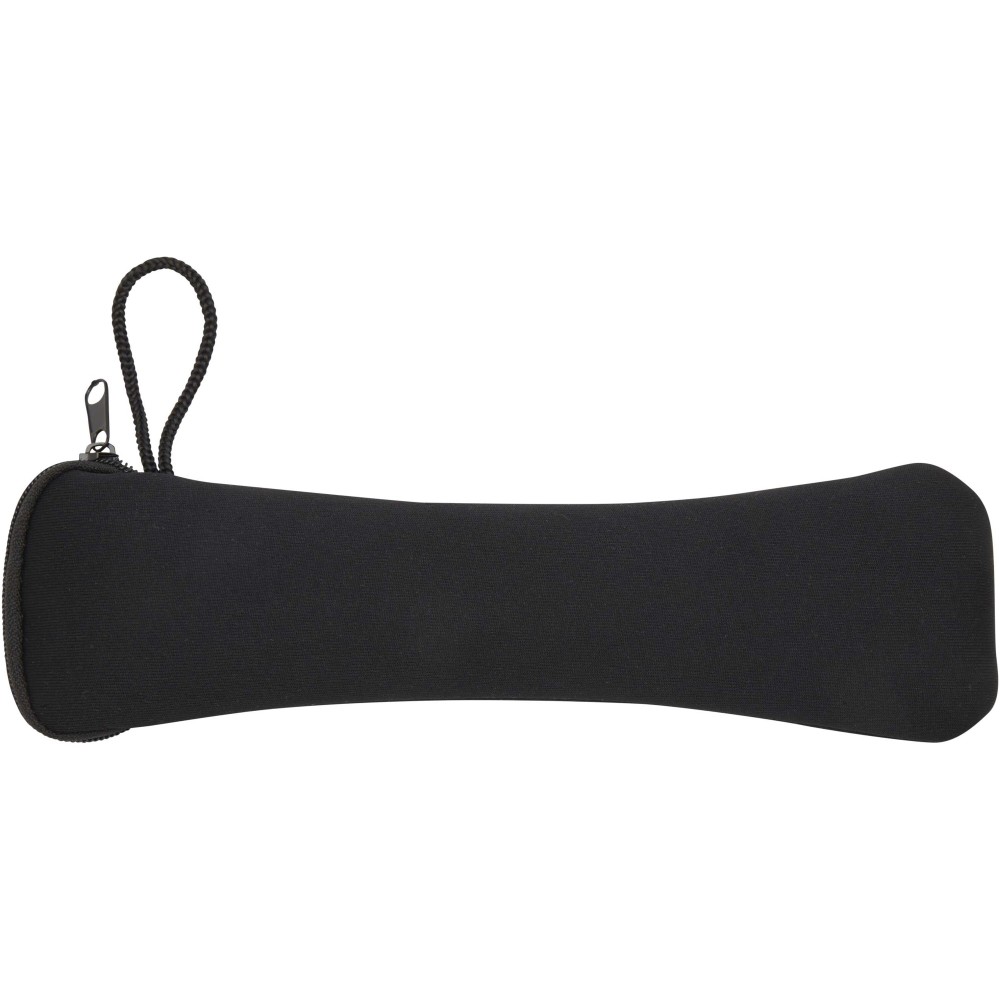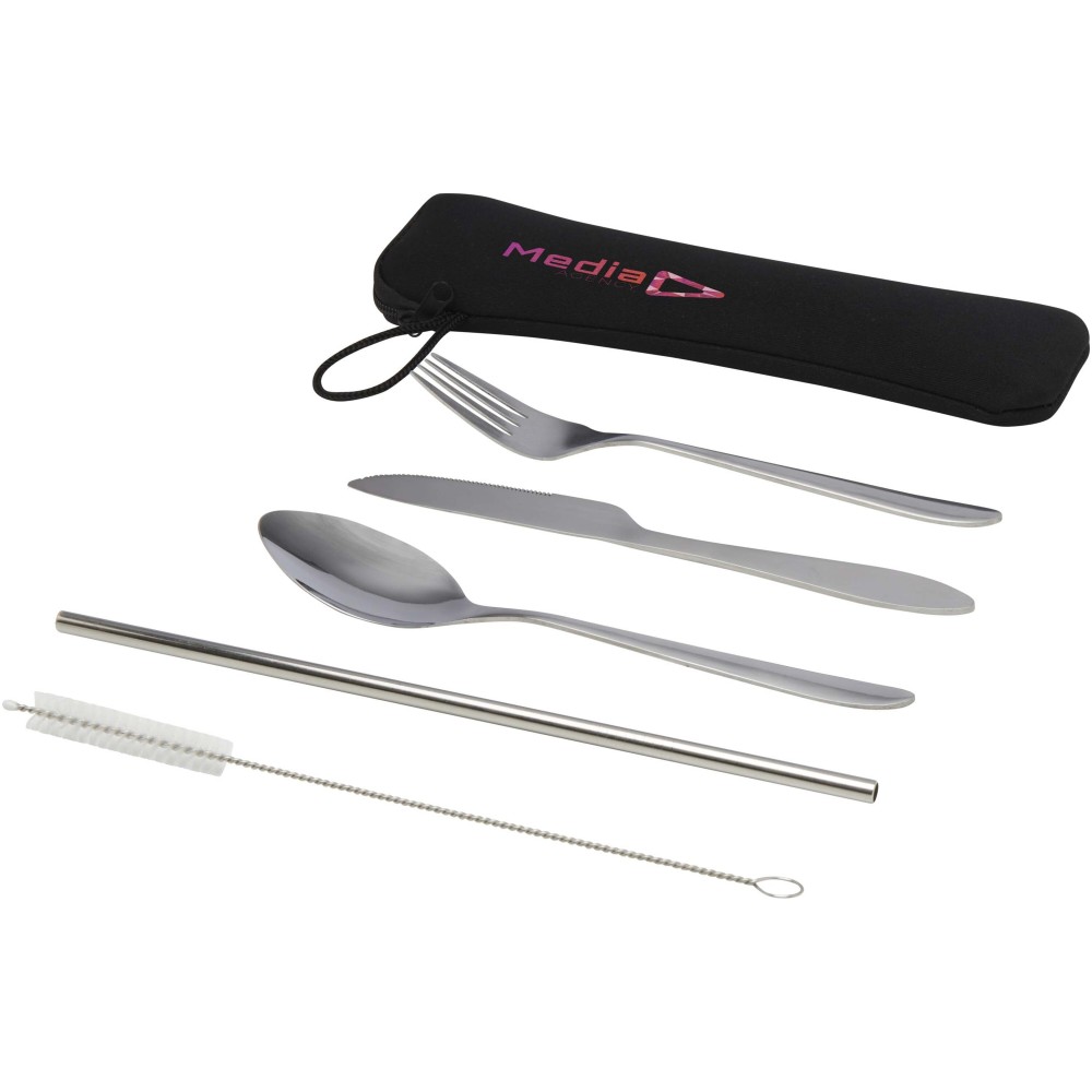 Evőeszköz-készlet, amely egy villát, kést, kanalat, szívószálat és egy tisztítókefét tartalmaz. Az evőeszközök tartós és könnyen tisztítható rozsdamentes acélból készültek. Cipzáras poliészter tasakban, praktikus hordozópánttal szállítjuk. Emblémázás: Gravírozás