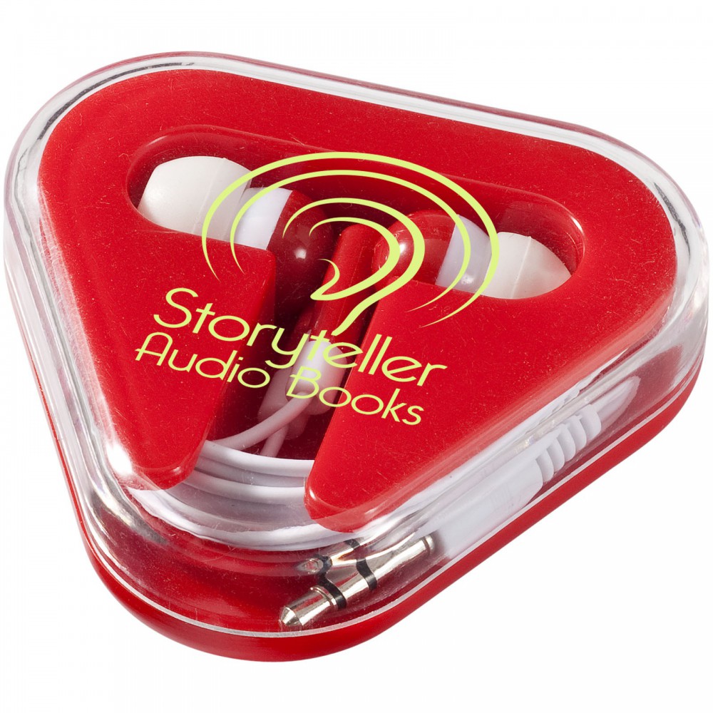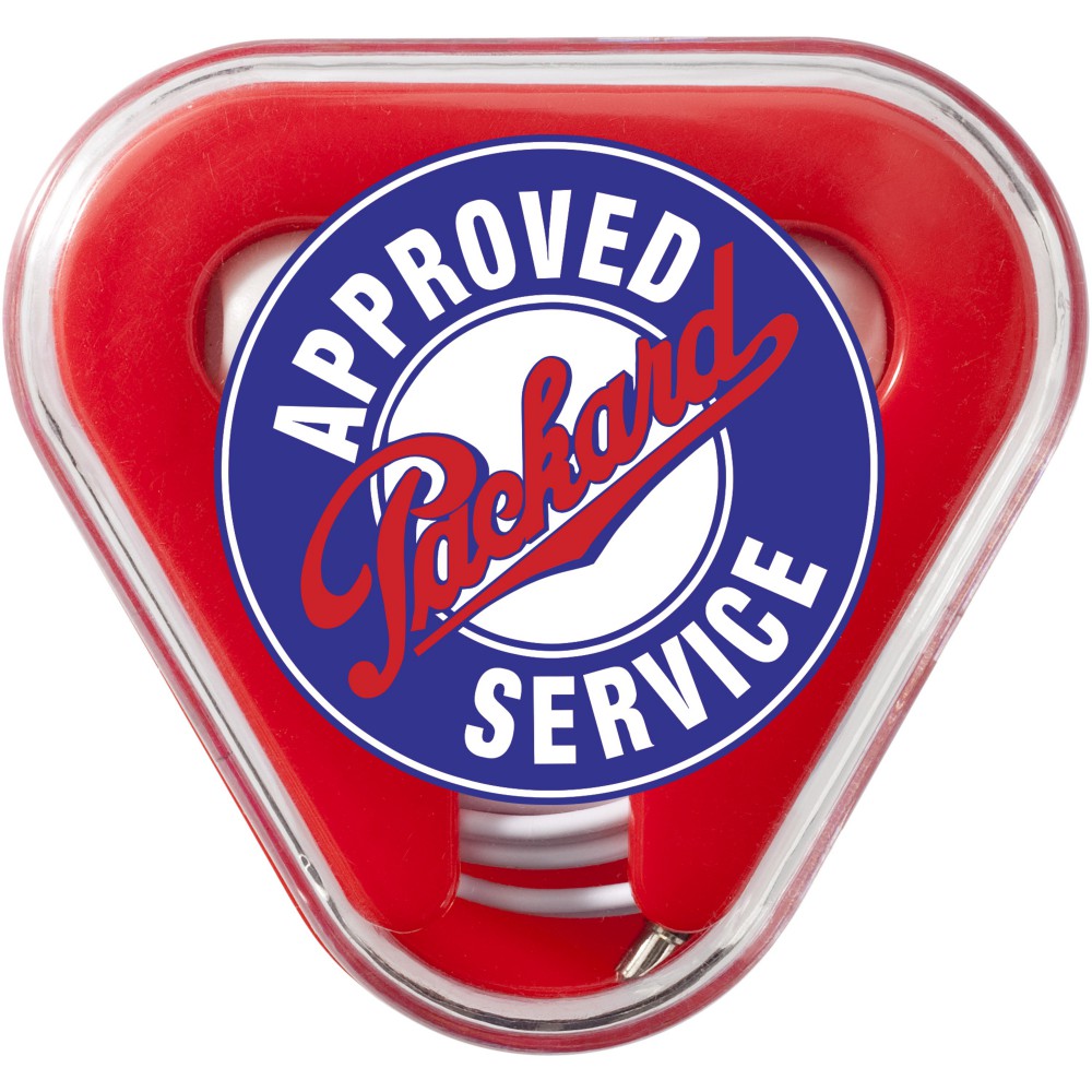 Háromszög alakú műanyag kábeltartó. Minden szabványos 3,5 mm-es audio csatlakozóval használható. Emblémázás: Tamponnyomás, UV nyomtatás