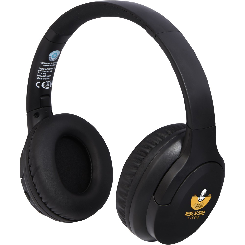 Vezeték nélküli fejhallgató RCS tanúsítvánnyal rendelkező újrahasznosított műanyagból. Az RCS (Recycled Claim Standard) egy szabvány a termék újrahasznosított tartalmának ellenőrzésére a teljes ellátási láncban. A fejhallgató tartalmaz egy mikrofont a telefonhívások fogadására, a nagy fejhallgató fantasztikus hangélményt biztosít. Bluetooth 5.2 akár 10 méteres csatlakozási hatótávolsággal. Ergonomikus, szivacsos kialakítás a kényelmes illeszkedésért. A fülkagylók felhajthatók és forgathatók. A beépített 300 mAh-s újratölthető akkumulátor akár 12 órás lejátszási időt biztosít maximális hangerőn. Ajándékdobozban, használati útmutatóval szállítjuk (mindkettő fenntartható anyagból készült). Újrahasznosított ABS műanyag. Emblémázás: Tamponnyomás