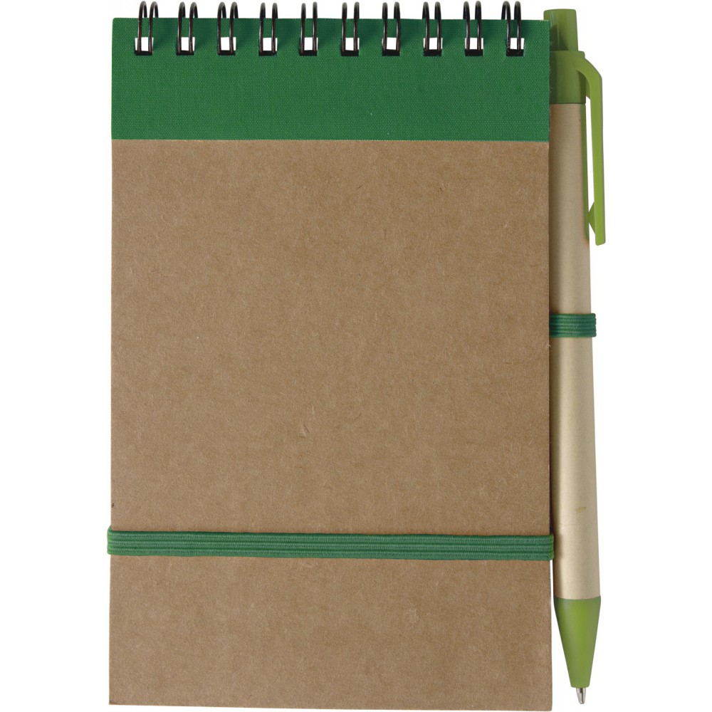 Spirálnotesz tollal, kék tollbetéttel, natúr/zöld