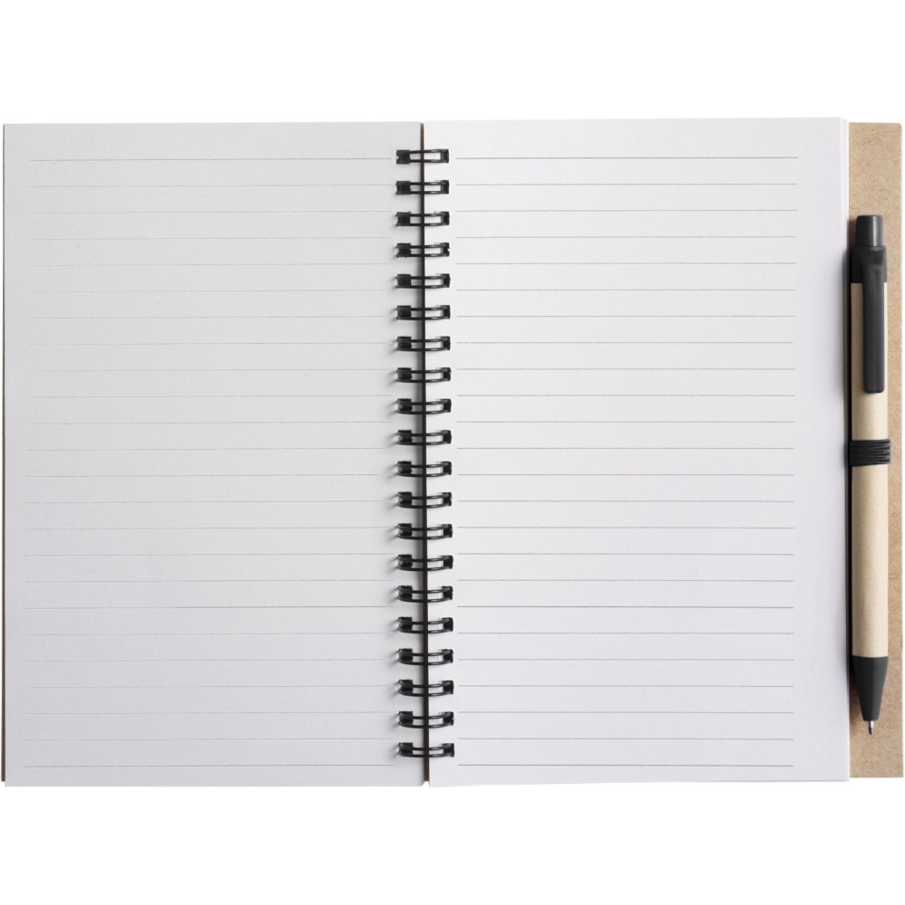 Újrahasznosított papírból készült spirálfüzet 60 vonalas lappal és golyóstoll biológiailag lebomló részekkel, kék tollbetéttel. Emblémázás: Szitanyomás, Tamponnyomás