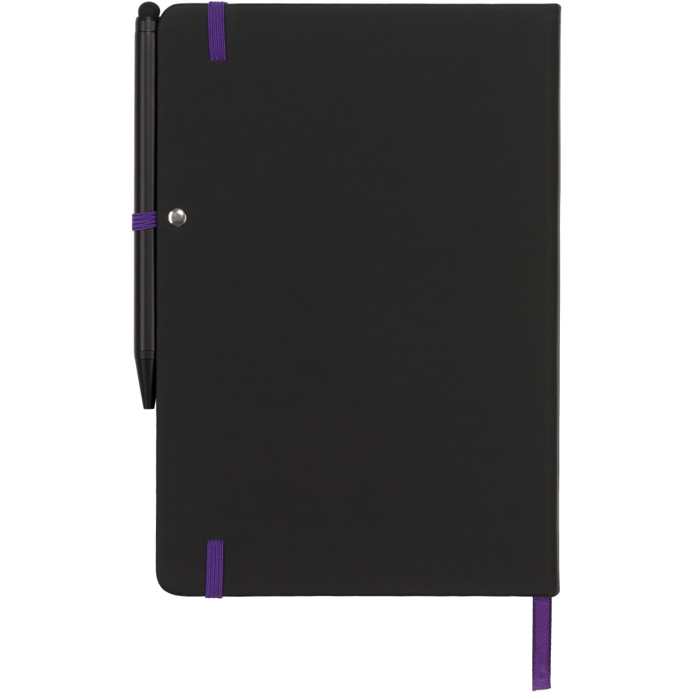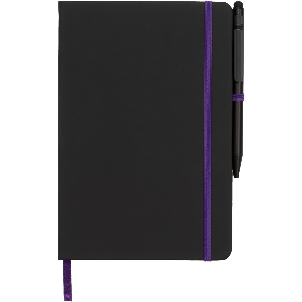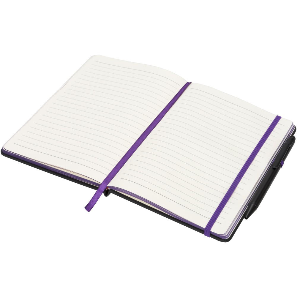 Puha felületű füzet színes lapélekkel, gumipánttal, könyvjelzővel és tullhurokkal és érintős golyóstollal. 96 krémszínű lapot tartalmaz. Emblémázás: Szitanyomás, Tamponnyomás, UV nyomtatás