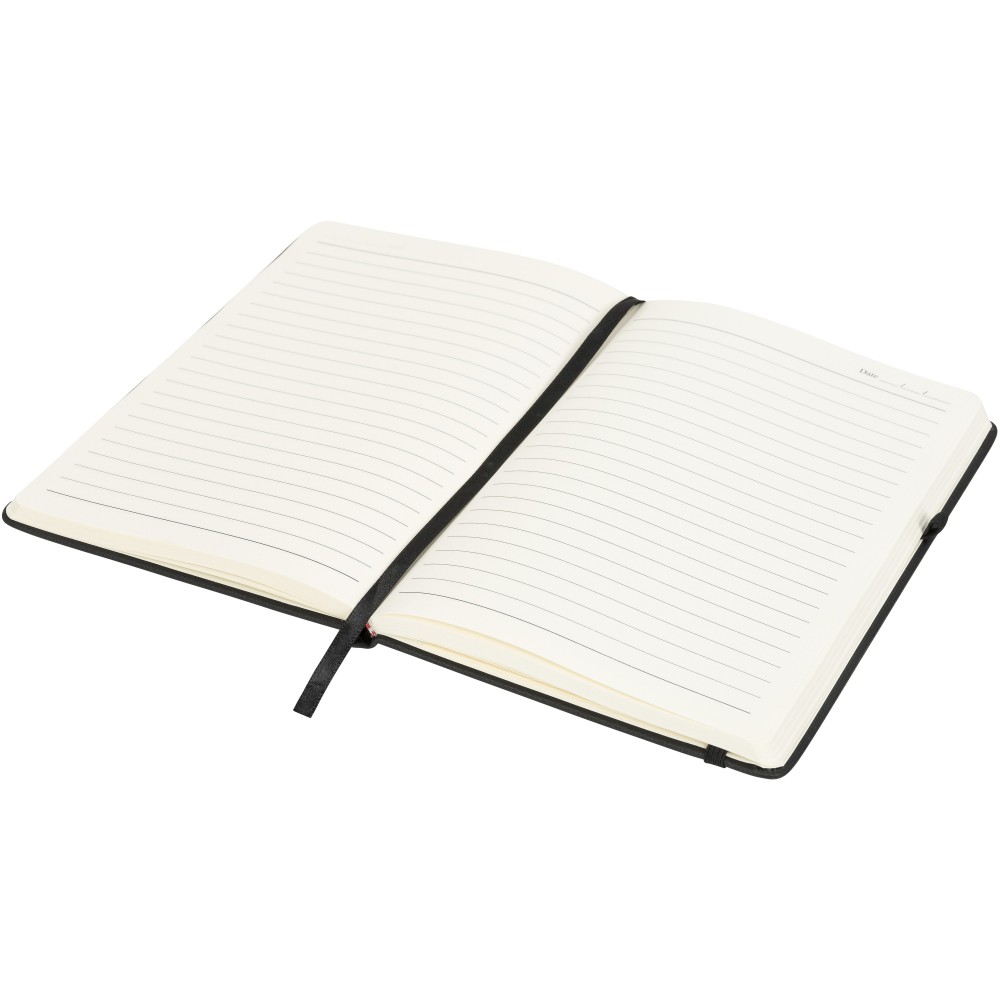 Színes füzet gumipánttal, könyvjelzővel, tollhurokkal. A hátsó borítóban tárolózseb. 128 krémszínű, vonalas lapot tartalmaz. Emblémázás: Szitanyomás, UV nyomtatás
