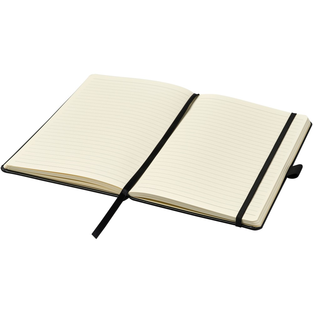 Műbőr A5-ös (14,2 cm x 21,4 cm) jegyzetfüzet gumiszalaggal, szalagjelölővel, tollhurokkal és harmonika hátsó zsebbel. 96 db vonalas krémszínű lapot tartalmaz (80 g/m2). Emblémázás: Tamponnyomás, UV nyomtatás