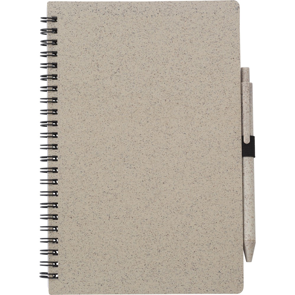 Szalma és PP műanyag felhasználásával készült füzet és golyóstoll (kék tollbetéttel). 70 vonalas lap. Kb. A5-ös méret. Emblémázás: Szitanyomás, Tamponnyomás
