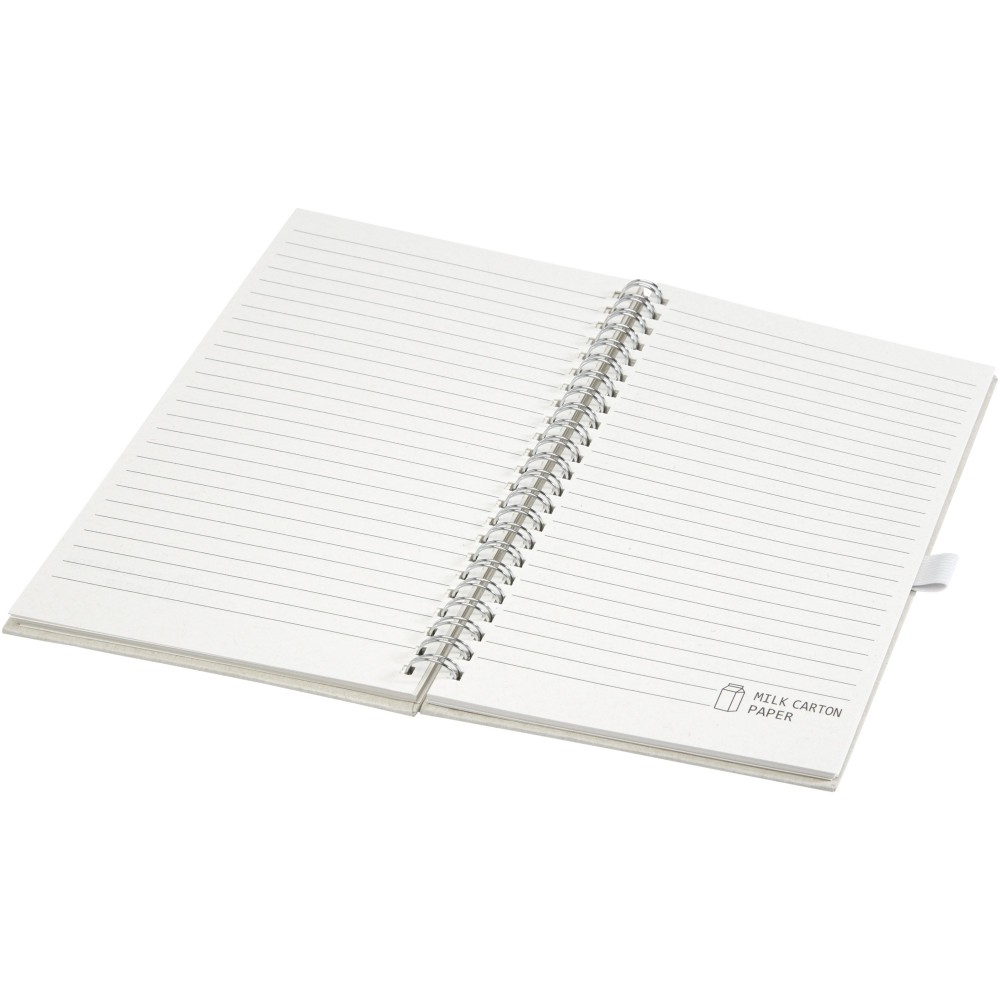 A5-ös méretű spirálfüzet 70 db 80 g/m2-es vonalas lappal, újrahasznosított tejesdobozokból (70%). A használt tejes kartondobozokat összegyűjtik, válogatják, feldolgozzák és papírrá alakítják, valóban hasznossá alakítva a hulladékot. Emblémázás: Tamponnyomás