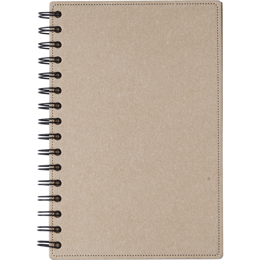 Újrahasznosított kartonból készült, keményfedeles spirálfüzet 80 vonalas, újrahasznosított barna papírlappal. Lapok minősége: 65 g/m2. Az újrahasznosított alapanyagra utaló logó minden lapon látható. Emblémázás: Tamponnyomás