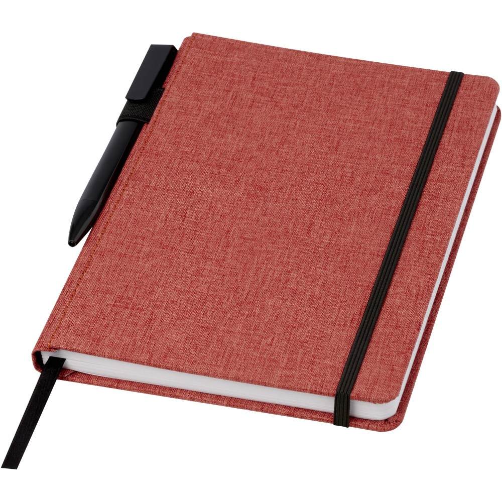 A5 méretű füzet tollhurokkal és könyvjelzővel, RPET polietilén szövetből. 96 lap 70 g / m2 újrahasznosított vonalas lap. Csomagolás: karton palást. Újrahasznosított műanyag, újrahasznosított papír. Emblémázás: Szitanyomás