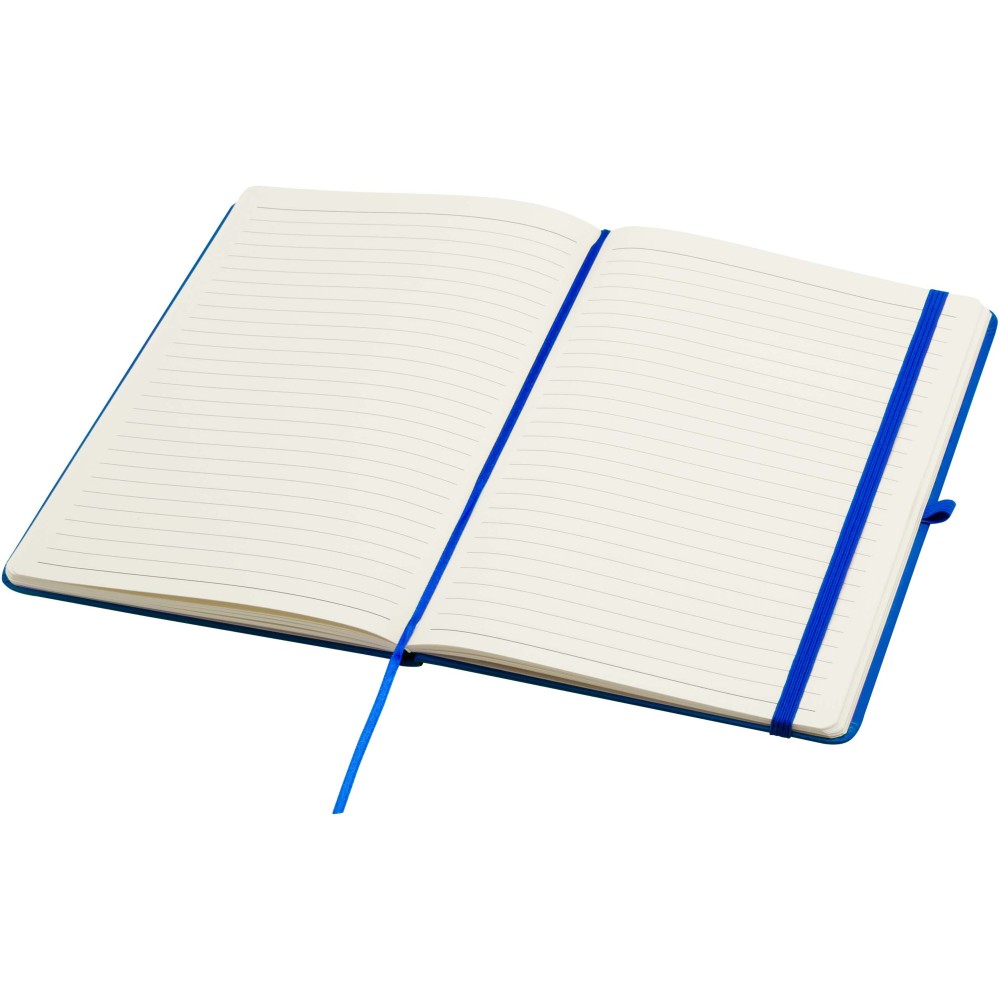 A Spectrum Plus A5 keményfedeles jegyzetfüzet lekerekített sarkokkal nemcsak az irodai mindennapok elengedhetetlen kelléke, hanem remek lehetőség márkád népszerűsítésére is. A jegyzetfüzet puha tapintású borítóval rendelkezik és 80 vonalas, krémszínű, 70 g/m2-es lapból áll, amely tökéletes gyors ötletek vagy hosszabb jegyzetek rögzítésére. A jegyzetfüzet tolltartó hurokkal, gumiszalagos záródással, könyvjelzővel és harmonikazsebbel van ellátva. Emblémázás: Tamponnyomás, UV nyomtatás