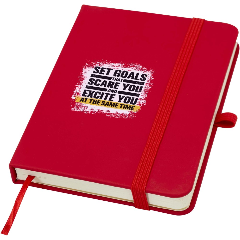 A Spectrum Plus A6 keményfedeles jegyzetfüzet lekerekített sarkokkal nemcsak az irodai mindennapok elengedhetetlen kelléke, hanem remek lehetőség márkád népszerűsítésére is. A jegyzetfüzet puha tapintású borítóval rendelkezik és 80 vonalas, krémszínű, 70 g/m2-es lapból áll, amely tökéletes gyors ötletek vagy hosszabb jegyzetek rögzítésére. A jegyzetfüzet tolltartó hurokkal, gumiszalagos záródással, könyvjelzővel és harmonikazsebbel van ellátva. Emblémázás: Tamponnyomás