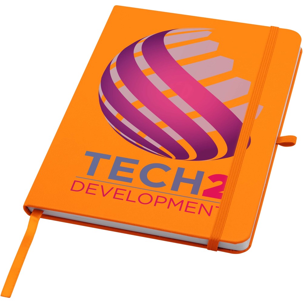 A Teak A5 méretű, újrahasznosított karton keménytáblás jegyzetfüzet lekerekített sarkokkal nemcsak irodai alapdarab, hanem kiváló lehetőség a márka népszerűsítésére is. A jegyzetfüzet 96 darab 70 g/m2-es vonalas lapot tartalmaz és puha tapintású borítóval rendelkezik. Beépített tolltartó hurokkal, rugalmas zárópánttal és könyvjelzővel van ellátva. Emblémázás: Tamponnyomás, UV nyomtatás