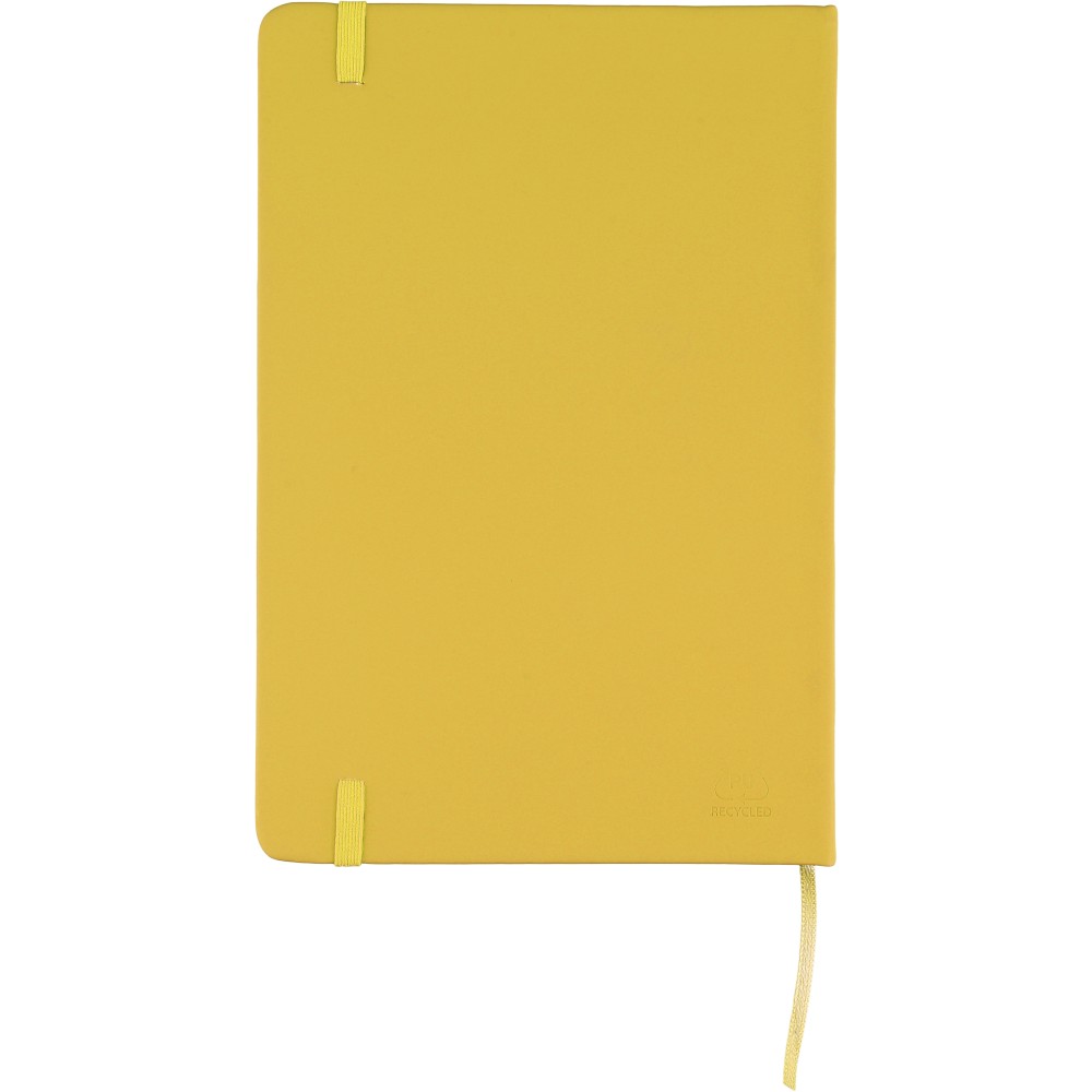 A5-ös méretű jegyzetfüzet rPET PU anyagból készült kemény borítóval, 80 vonalas lappal (70g/m2), színben illeszkedő gumipánttal és könyvjelző szalaggal. Az újrahasznosított anyagra utaló dombornyomott logóval a füzet hátoldalán. Emblémázás: Szitanyomás, Tamponnyomás, UV nyomtatás