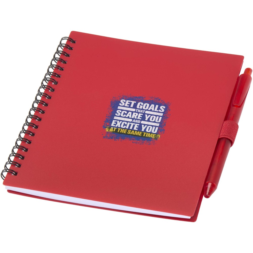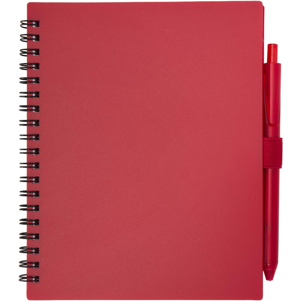 A Niove puhafedeles jegyzetfüzet újrahasznosított műanyagból készült, 70 darab, pontozott, 70 g/m2 papírlappal. A jegyzetfüzet sarkai lekerekítettek, és tolltartóhurokkal rendelkezik. Mérete: 140 × 178 mm. A golyóstoll szintén újrahasznosított műanyagból készült. Tollbetét színe: kék. Íráshossz: 1000 méter. Hegyméret: 1,0 mm. Emblémázás: Szitanyomás, Tamponnyomás